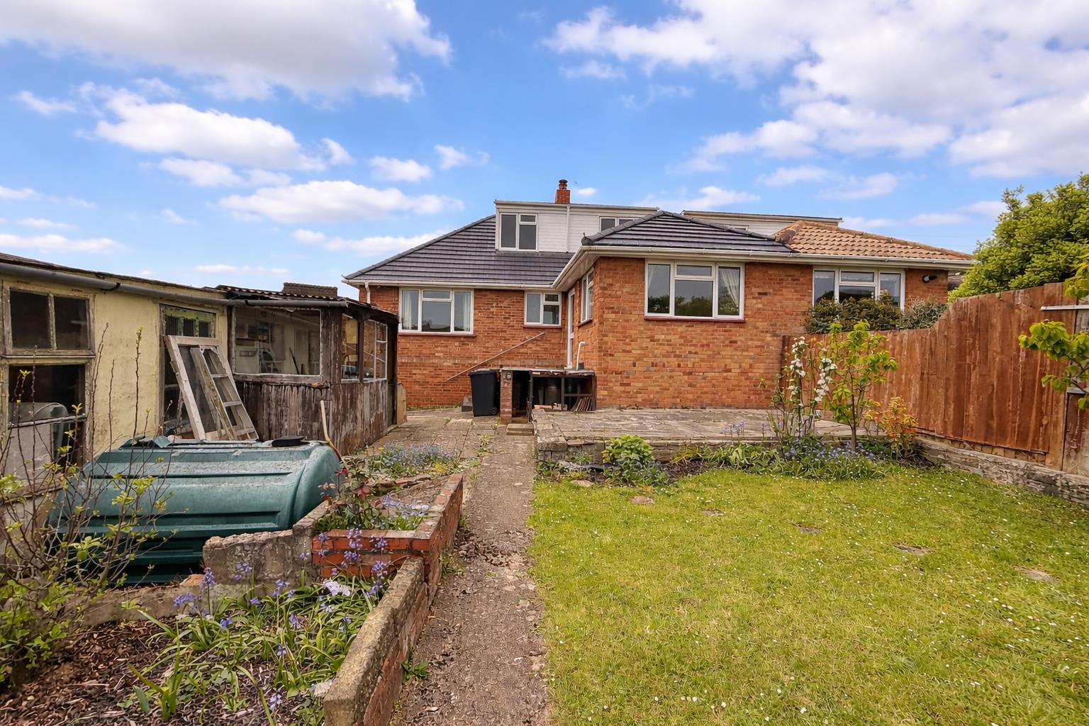 The rear garden there is a patio area, a raised patio area, a pathway, a laid to lawn area, pond, oil tank, garden shed. This is all surrounded by fencing.