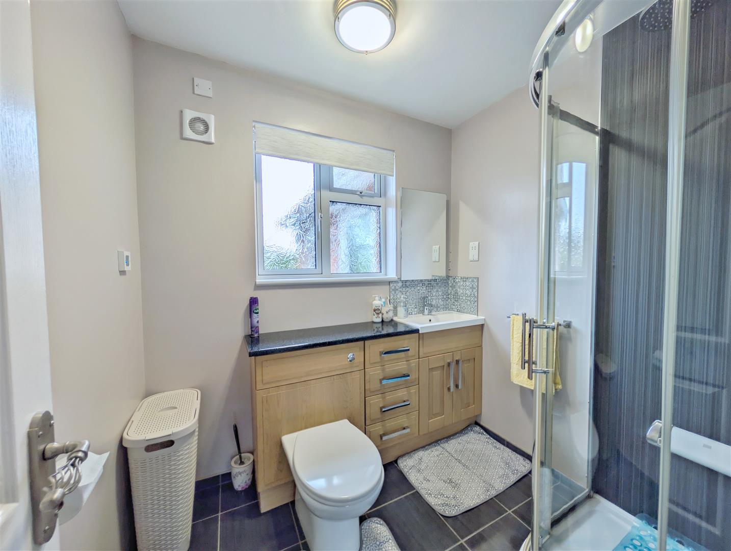 Bathroom - 2.13m x 1.85m (7'00 x 6'01) - Comprising corner shower with mains shower, vanity wash hand basin, low level WC and storage drawers, with tiled flooring, heated towel rail and rear aspect UPVC double glazed frosted window.