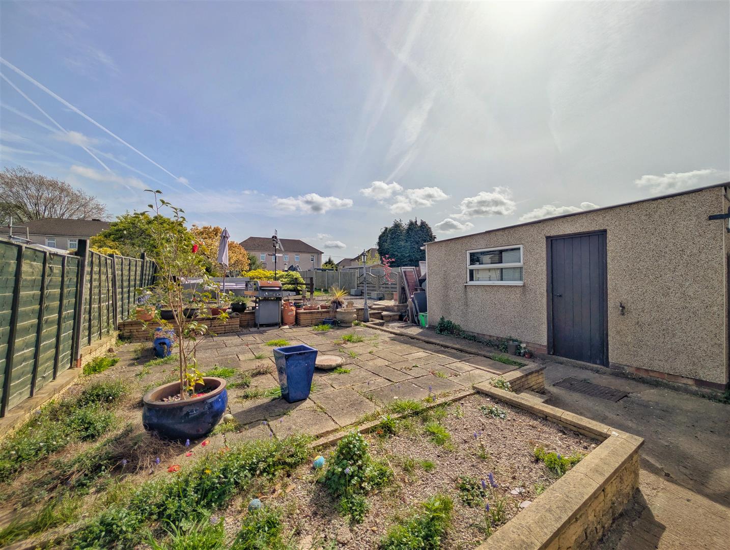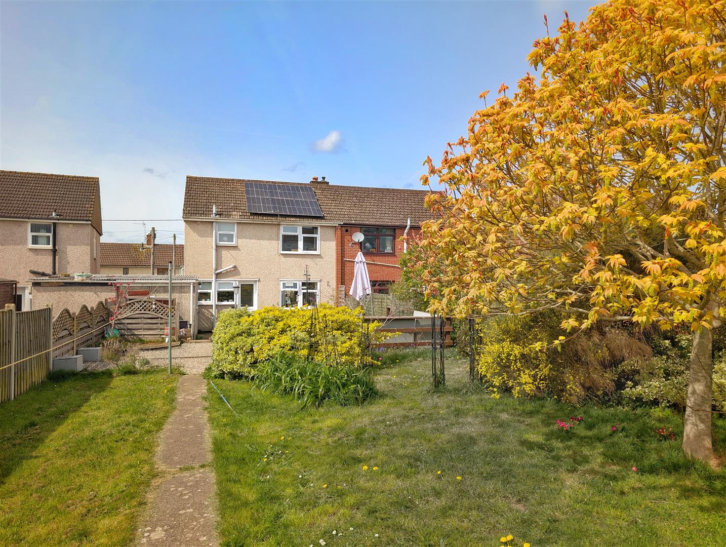 Outside - To the front of the property there is a lawned garden with mature shrubs and a pathway leading to the front door and providing side access to the rear.