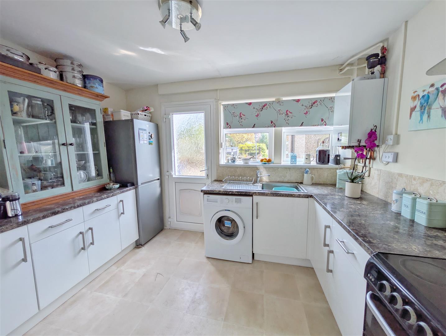 Kitchen - 3.43m x 2.67m (11'03 x 8'09) - Fitted with a range of base, wall and drawer mounted units with rolled edge worktops and tiled splashbacks. Space for cooker, fridge freezer and plumbing for washing machine. Recently fitted wall mounted Glow Worm combination boiler (January 2026). Radiator, power points, rear aspect double glazed UPVC window and door leading out to the garden.