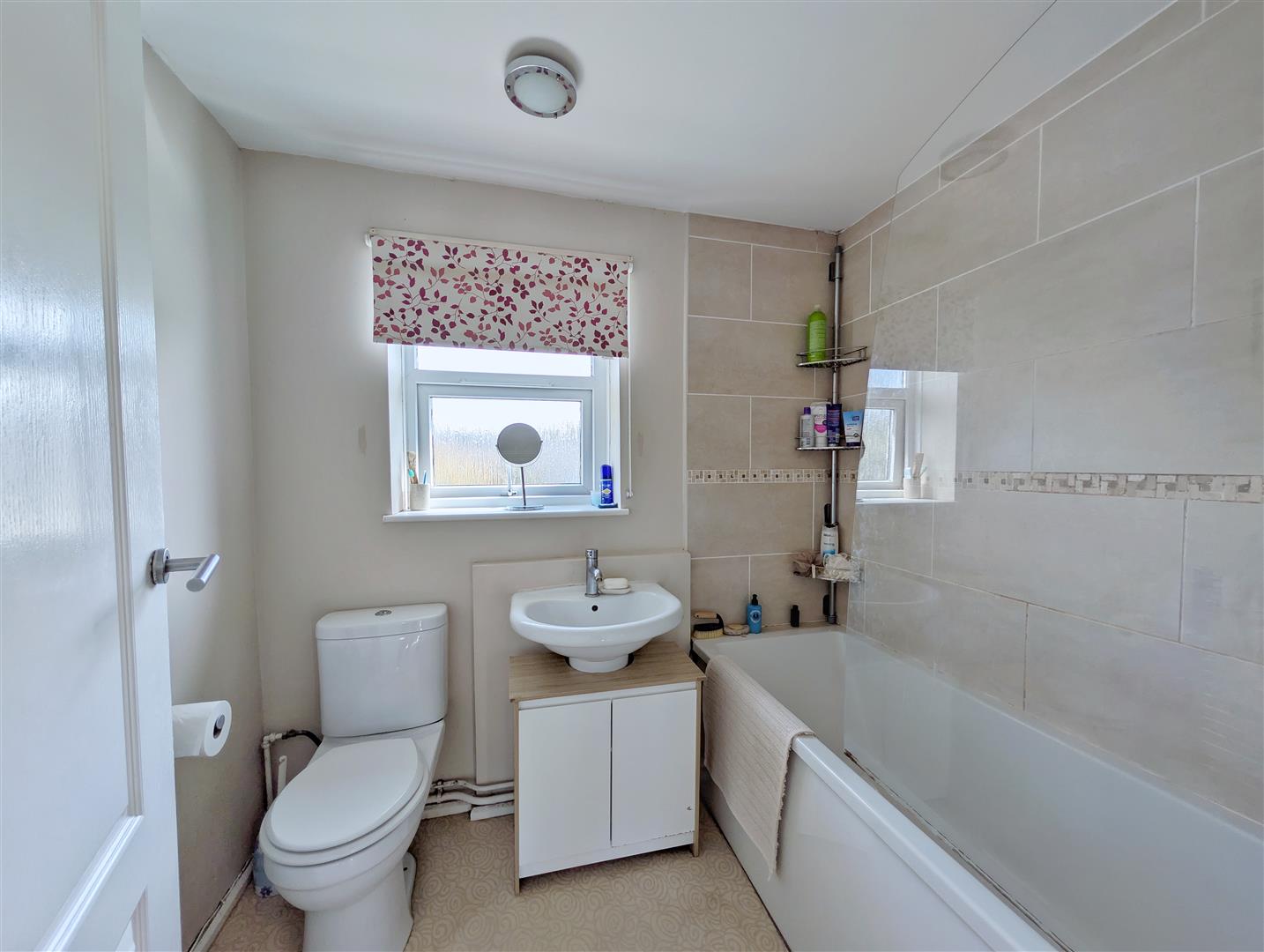 Bathroom - 2.18m x 1.65m (7'02 x 5'05) - Comprising panelled bath with electric shower over and tiled surround, low level WC and pedestal wash hand basin. Heated towel rail and rear aspect obscured double glazed UPVC window.