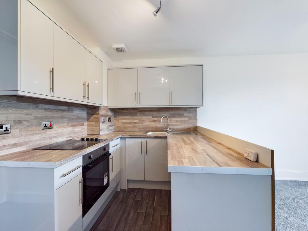 Open Plan Kitchen/ Living - 4.93m x 4.04m (16'02 x 13'03) - A bright and well-presented open-plan living space incorporating a modern fitted kitchen with a range of base and wall units, wood-effect worktops and integrated oven with electric hob. The room provides ample space for lounge seating and dining, creating a comfortable and practical everyday living area.
