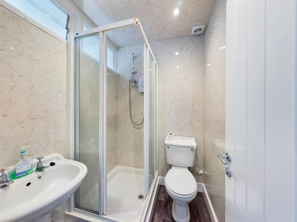 Shower Room - 1.68m x 1.47m (5'06 x 4'10) - Fitted with a modern white suite comprising enclosed shower cubicle, pedestal wash hand basin and low-level WC, complemented by contemporary wall finishes.