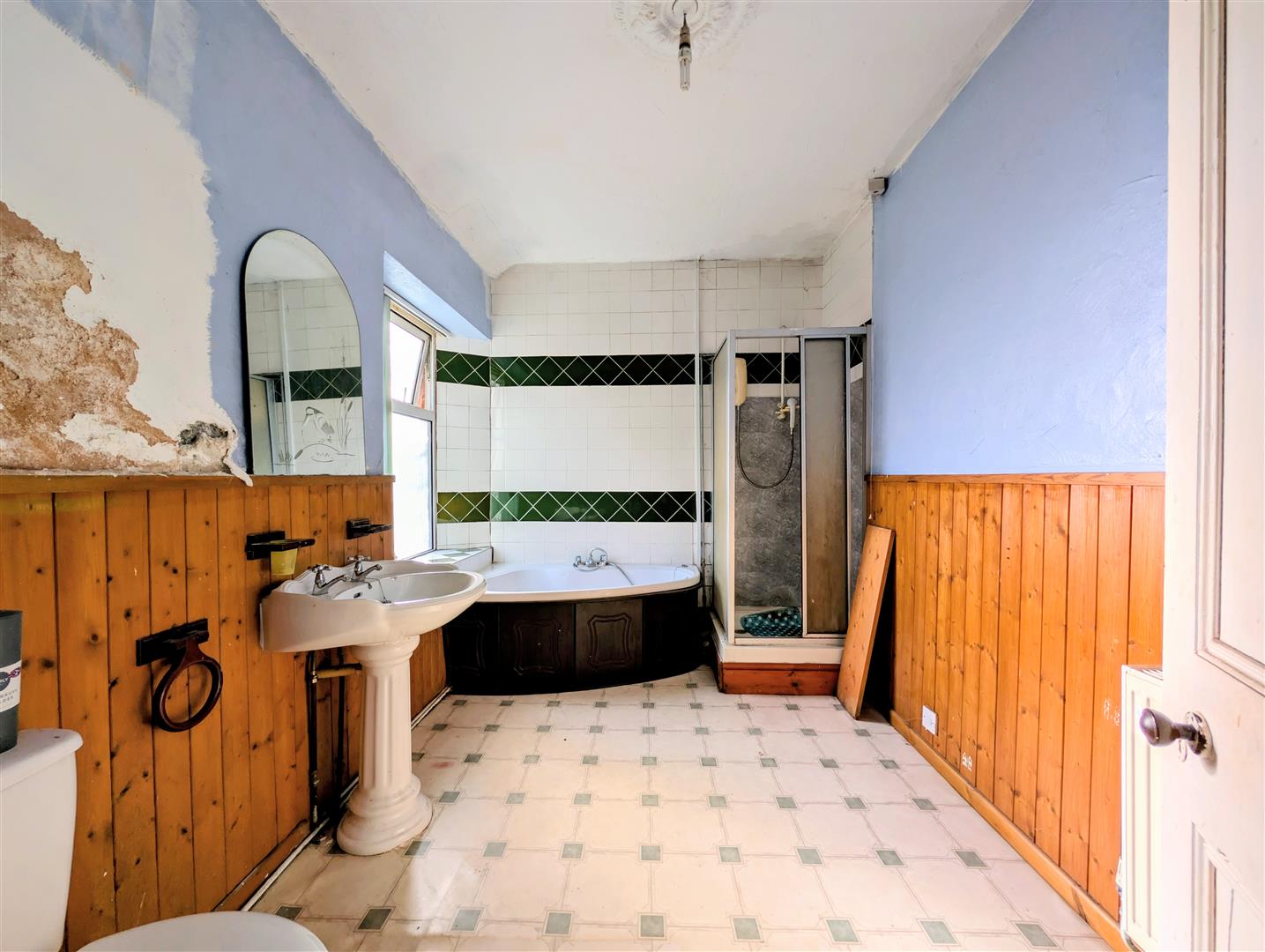 Bathroom - 11'04" x 7'10" - Fitted with a corner bath, separate shower cubicle, pedestal wash hand basin, and WC. The bathroom also benefits from a radiator, part tiled and part panelled walls, and a side aspect frosted aluminium double glazed window.