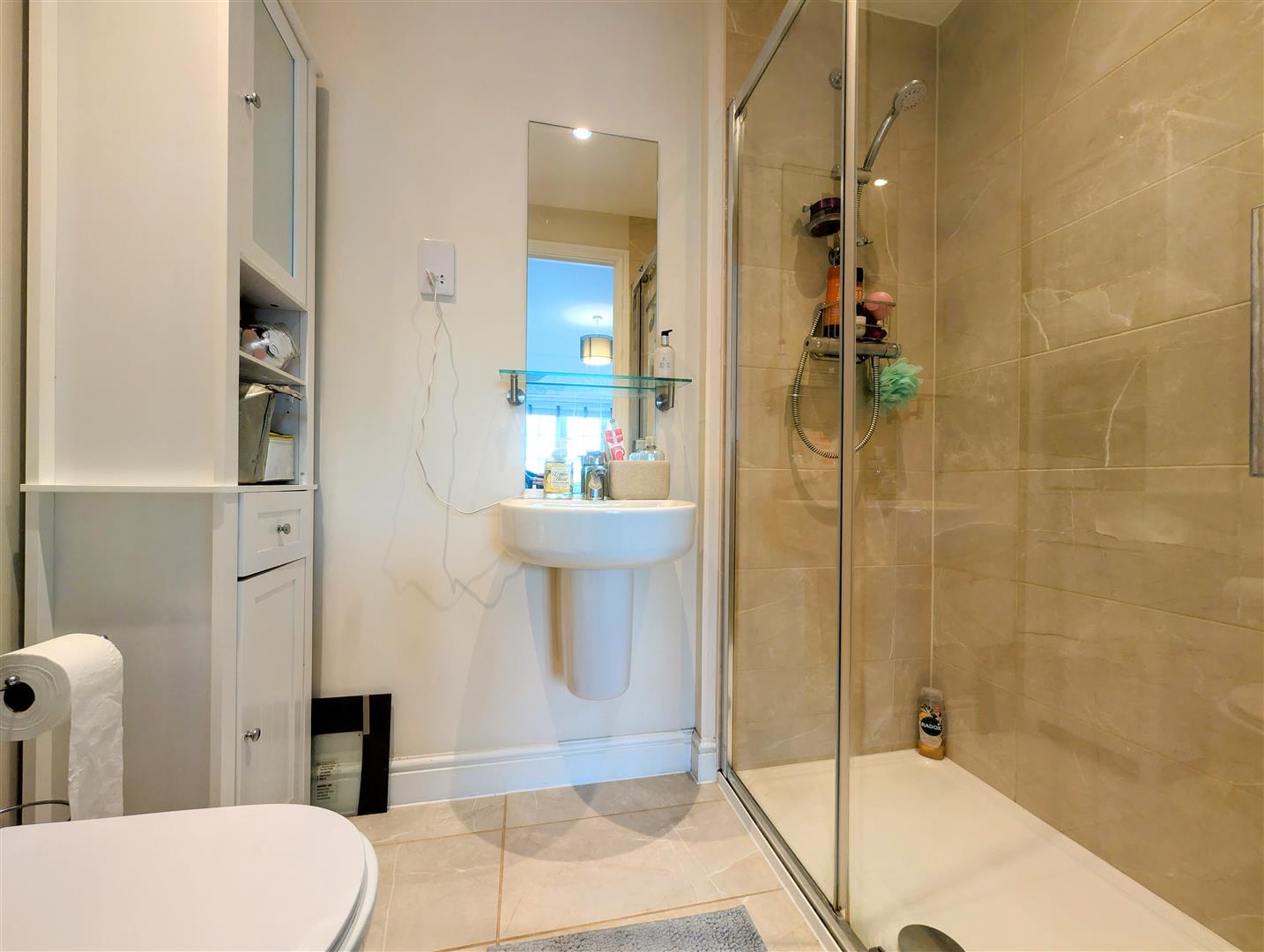 En-Suite - 2.13m x 1.24m (7'00 x 4'01) - Walk-in double shower with mains shower and full tiling. Wall-mounted wash hand basin, low-level WC, heated towel rail, tiled flooring, extractor fan, and ceiling spotlights.