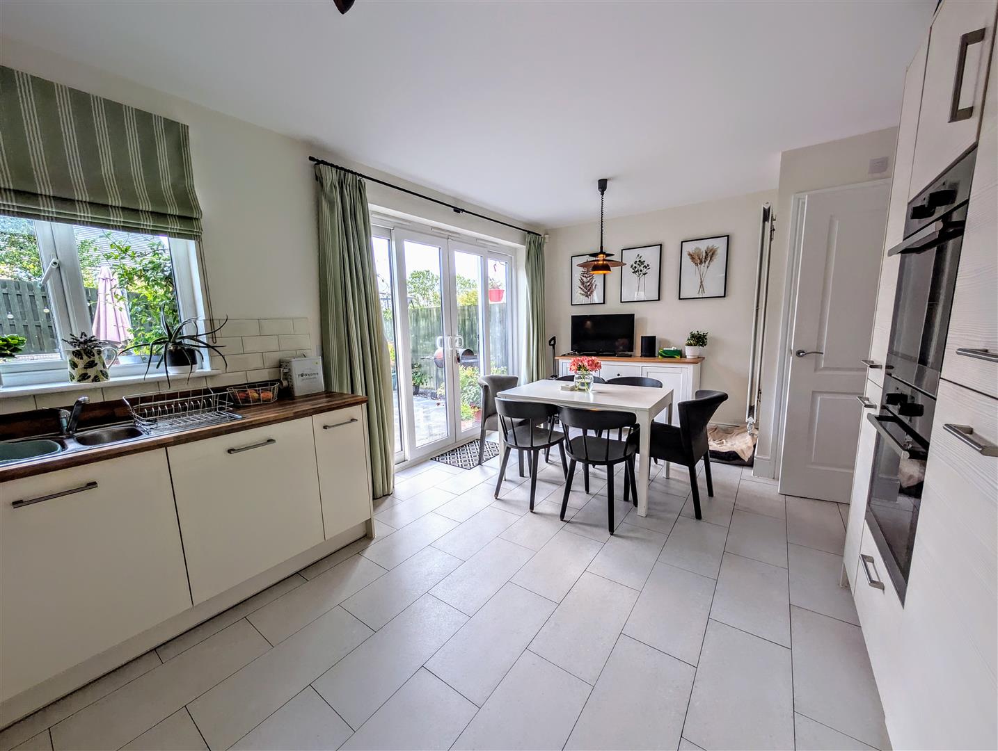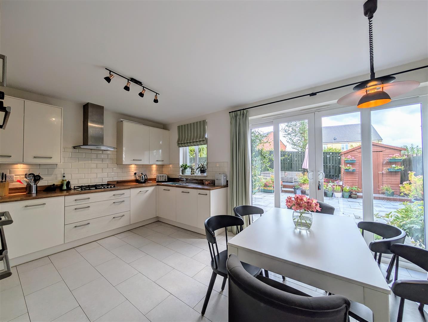 Kitchen/ Diner - 5.44m x 3.48m (17'10 x 11'05) - Range of wall, base and drawer units with wood-effect worktops. Integrated appliances include two AEG ovens, four-ring AEG gas hob with stainless steel extractor hood above, dishwasher, half-and-half fridge freezer, and one-and-a-half bowl stainless steel sink unit. Part-tiled walls, tiled flooring, power and appliance points, wall-mounted column radiator. Laundry cupboard with plumbing for washing machine. Space for dining table and chairs. Rear aspect UPVC double glazed window and UPVC sliding doors to garden.