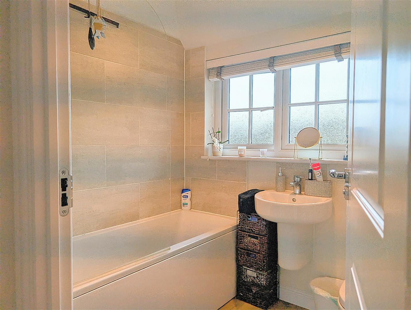 Bathroom - 2.01m x 1.70m (6'07 x 5'07) - Suite comprising panel bath with mains shower over and full tiling, wall-mounted wash hand basin, low-level WC, heated towel rail, tiled flooring, extractor fan, ceiling spotlights, and front aspect UPVC frosted window.