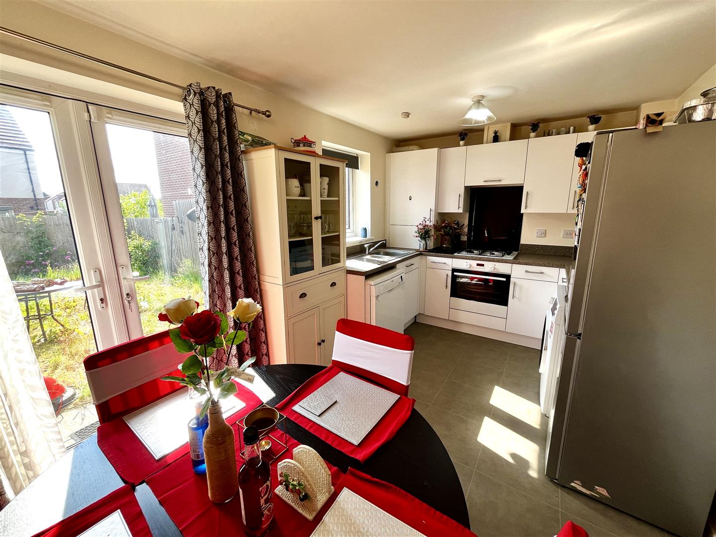 Kitchen - 4.24m x 2.59m (13'11 x 8'06) - A range of base, drawer and wall mounted units, built in oven and hob, tiled splashback and extractor fan, one and a half bowl drainer sink unit, Ideal combination boiler, space for dishwasher, space for washing machine, space for fridge/freezer, patio doors giving access to the rear garden.