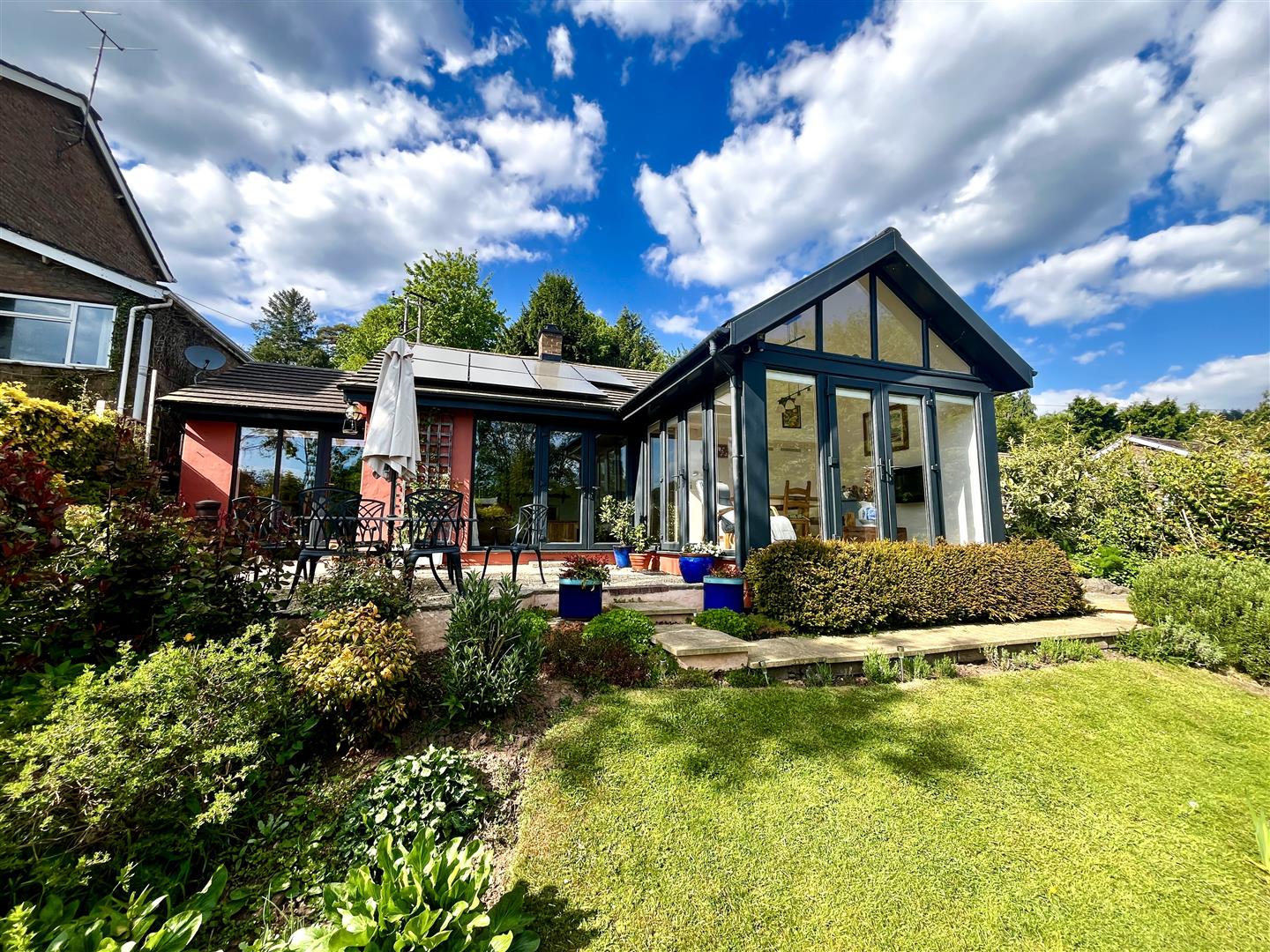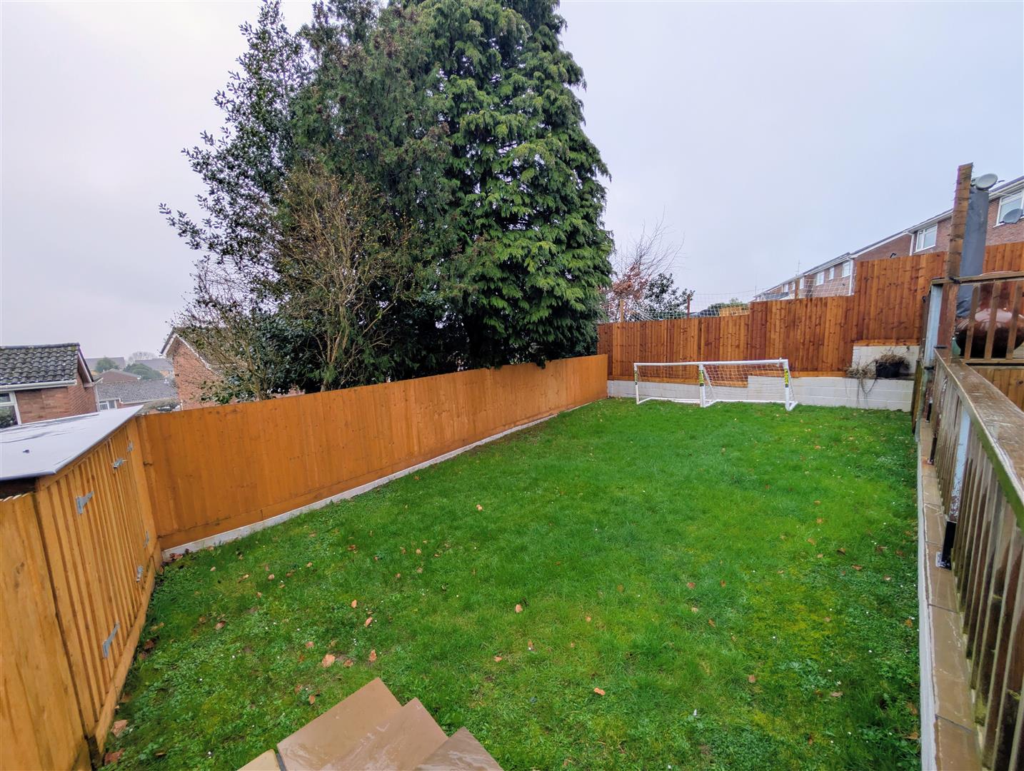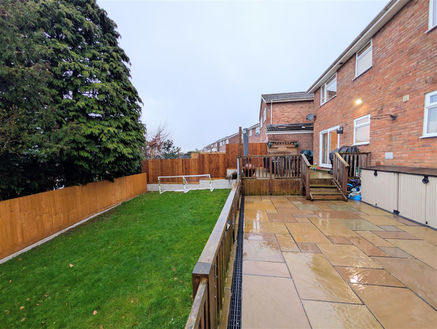 The rear garden enjoys a wonderful elevated decked seating area, ideal for entertaining, with steps leading down to a lower lawned area with a built in shed.