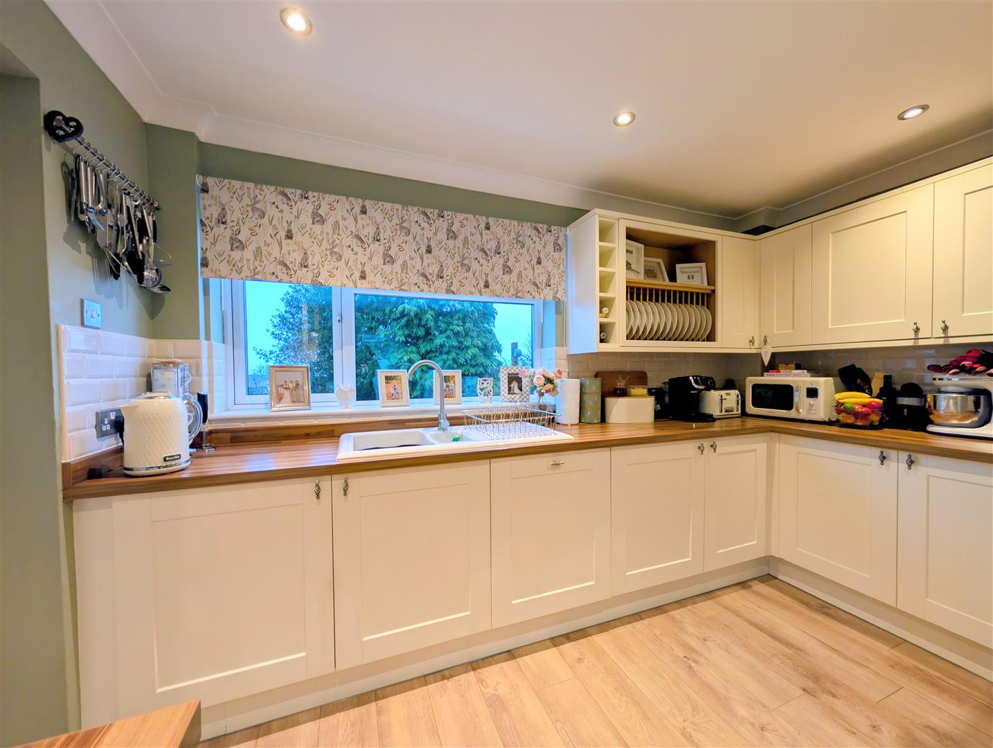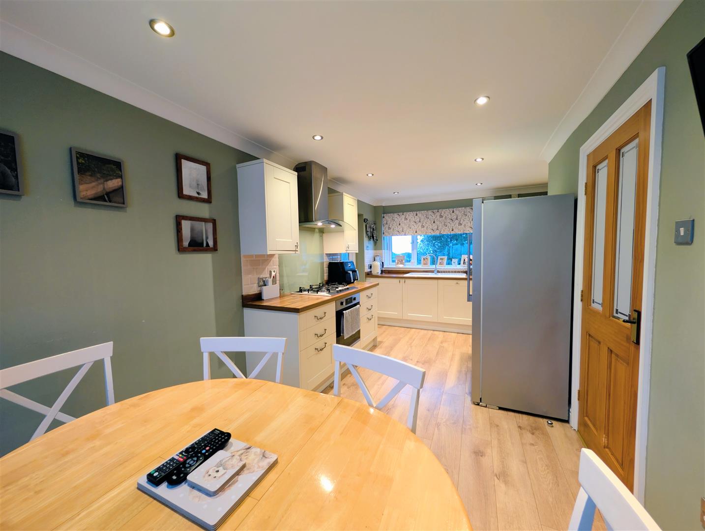 Kitchen/Diner - 5.69m x 3.76m (18'08 x 12'04) - Fitted with a range of base, wall and drawer mounted units with worktops over. Five ring gas hob with oven beneath and extractor hood above with glass splashback. One and a half bowl single drainer ceramic sink unit with mixer tap. Built in dishwasher. Space for fridge freezer. Power points. Appliance points. Part tiled walls. Inset ceiling spotlights. Space for dining table and chairs. Television point. Front and rear aspect double glazed UPVC windows.