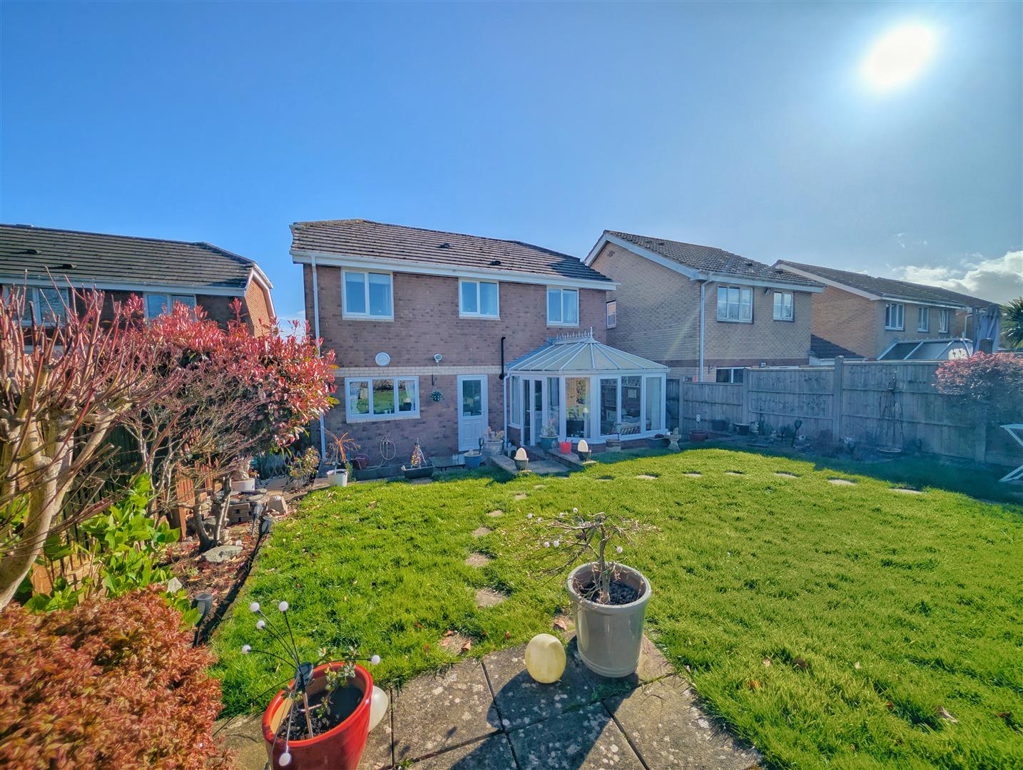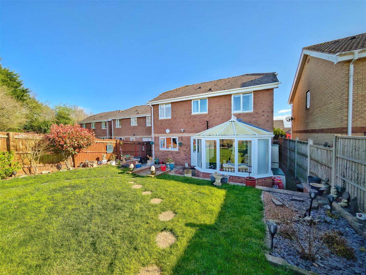 A well presented and enclosed rear garden mainly laid to lawn, complemented by patio and seating areas ideal for outdoor entertaining. The garden enjoys a good degree of privacy and backs onto open fields, creating a pleasant outlook.