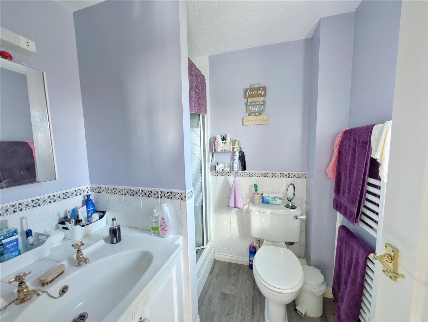 Ensuite - 1.93m x 1.78m (6'04 x 5'10) - Comprising shower, vanity wash hand basin and WC, heated towel rail, part tiled walls and front aspect UPVC double glazed frosted window.