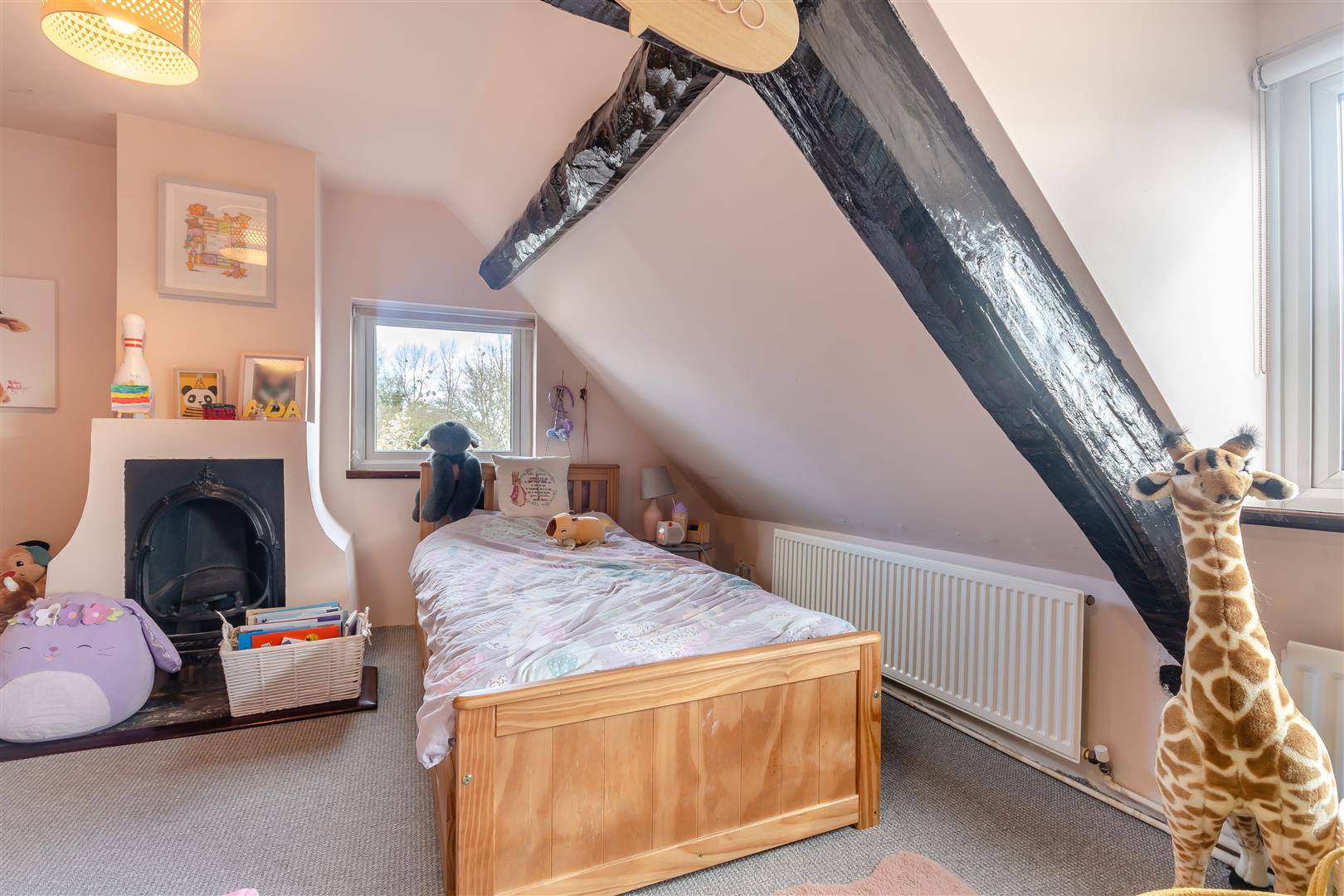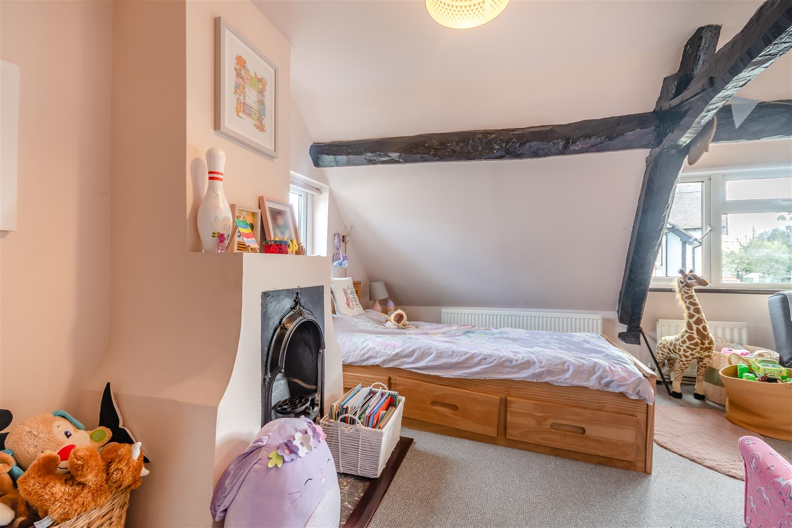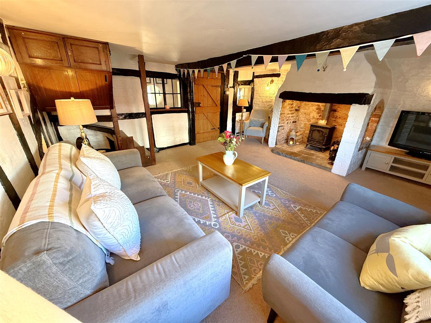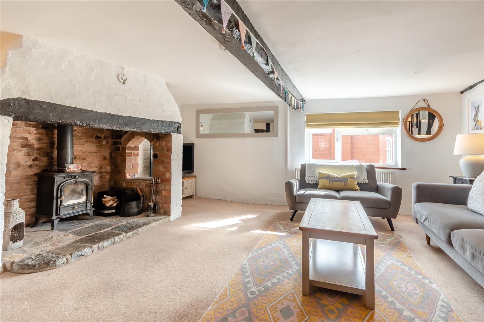 Lounge - 4.88m x 4.57m (16'76 x 15'37) - Beautiful original fireplace with stone hearth, wood mantle over, brick surround, inset wood burner, original wooden beams, two original windows looking into inner hall, TV point, power points, radiator, front aspect UPVC double glazed window.