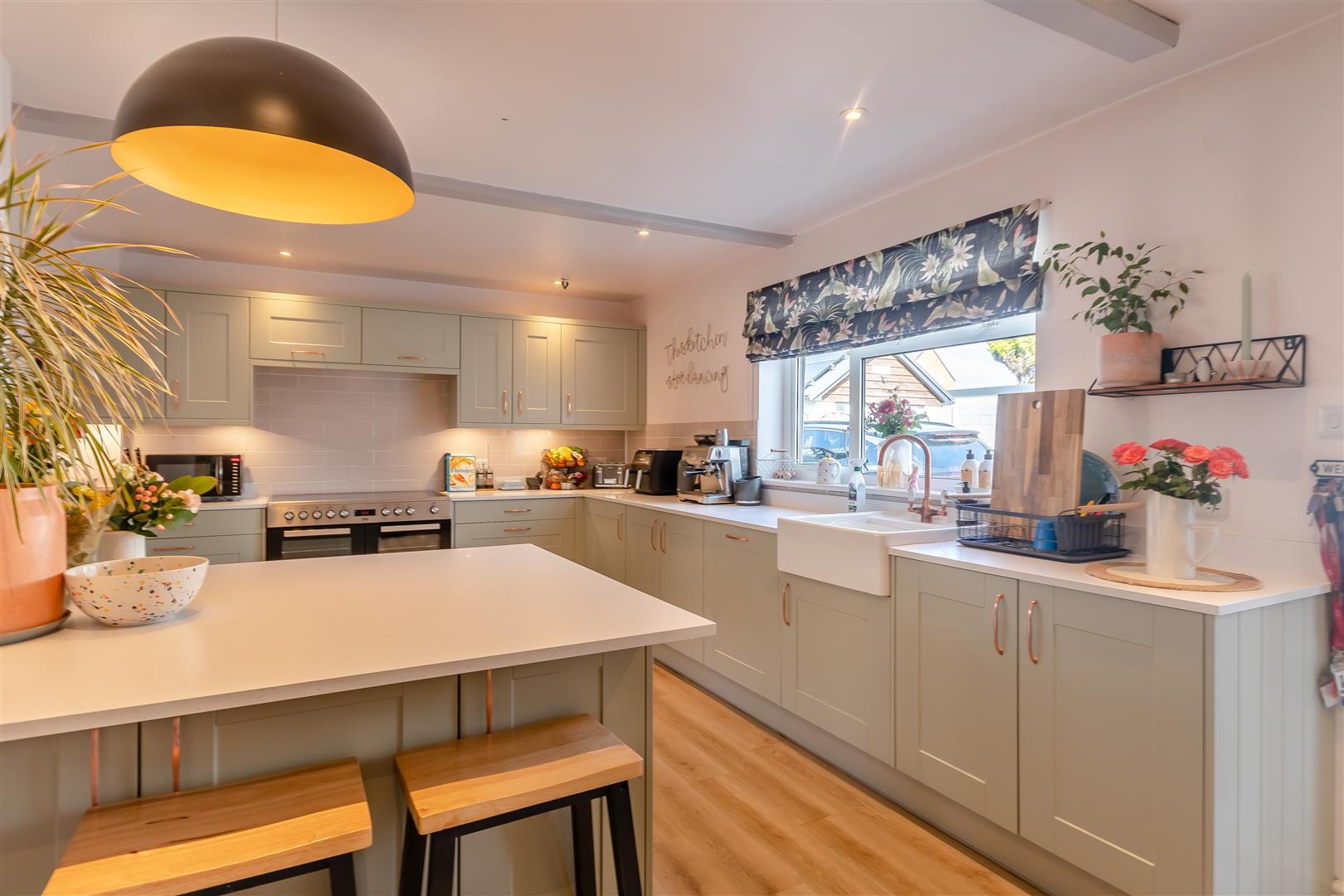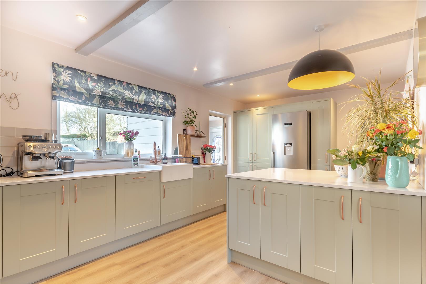 Kitchen - 5.79m x 3.35m (19'89 x 11'21) - Newly fitted, range of base, wall and drawer mounted units, Belfast sink with mixer tap over, quartz effect worktops, centre island with seating, space for large range style cooker, built-in dishwasher, large pantry style cupboard, space for large fridge / freezer, cupboard, radiator, inset ceiling lights, partly tiled walls, side aspect UPVC double glazed window, wooden door into: