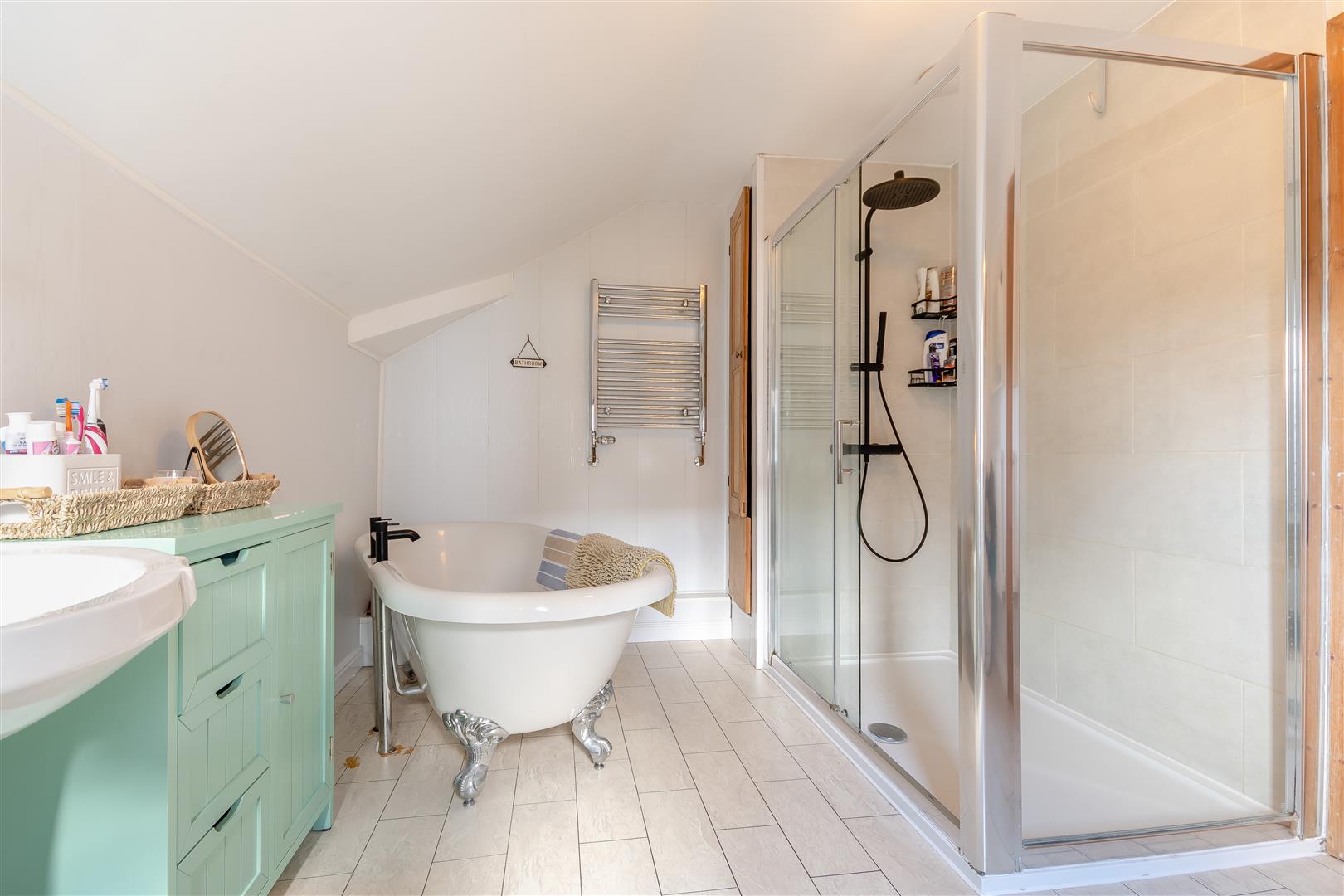 Bathroom - 3.35m x 2.44m (11'88 x 8'62 ) - Double shower cubicle with fully tiled walls and rainfall shower, free standing bath with mixer tap over, low level WC, pedestal wash hand basin, heated towel rail, radiator, side aspect UPVC double glazed window.