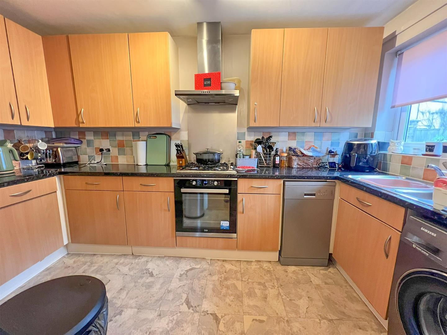 Kitchen - 3.76m x 1.91m (12'04 x 6'03) - One and a half bowl single drainer stainless steel sink unit with monobloc mixer tap over, rolled edge worktops, range of base and wall mounted units, brushed stainless steel four ring gas hob with electric oven beneath, filter hood extractor above, space for automatic washing machine, half sized dishwasher, space for freestanding fridge/freezer, directional ceiling spots, tiled surrounds, power points, double radiator, front aspect upvc double glazed window overlooking the front courtyard garden.