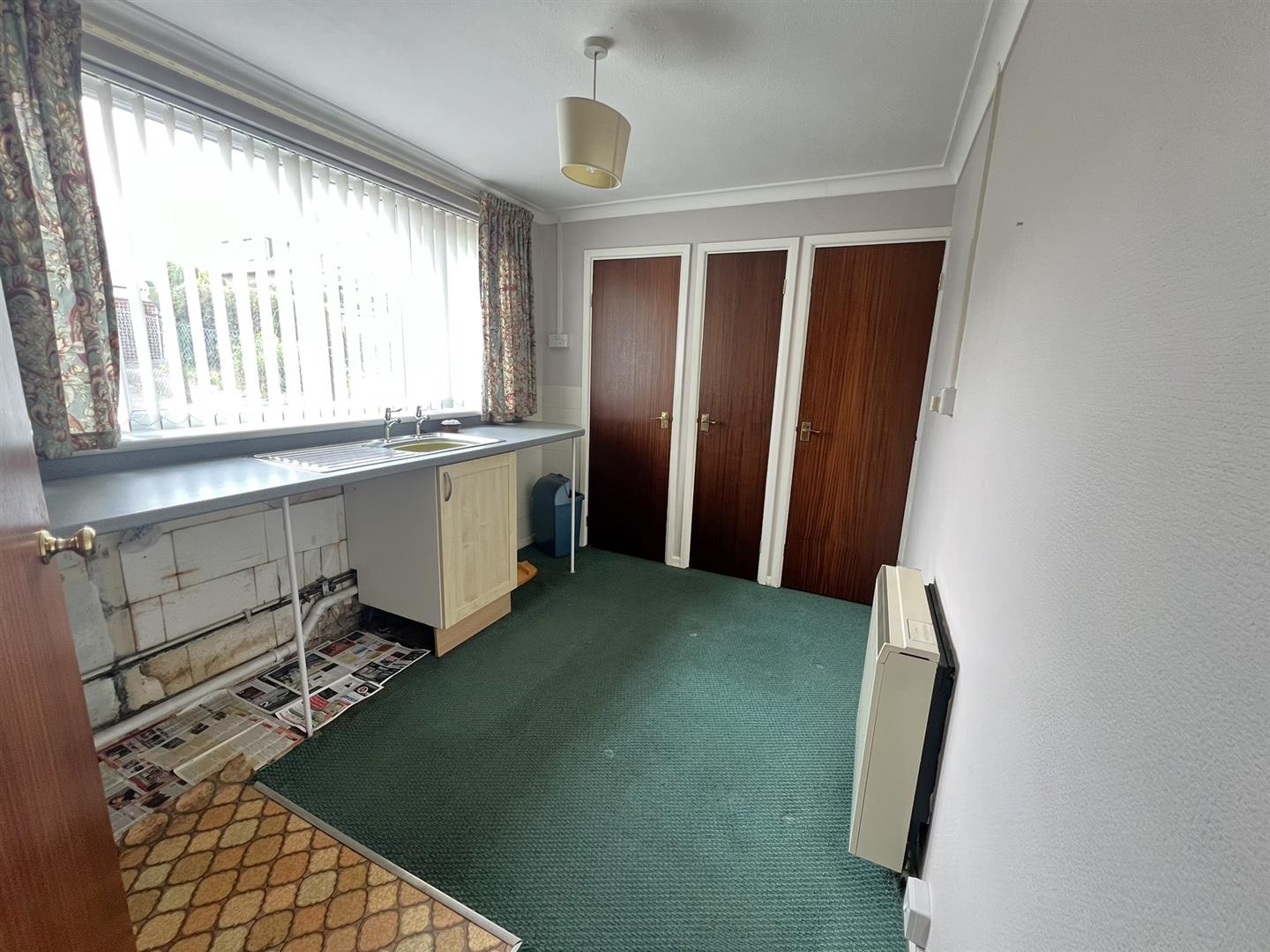 Kitchen - 3.25m x 2.36m (10'08 x 7'09) - Single bowl, single drainer stainless steel sink unit, rolled edge worktops, matching upstands, tiled walls, space and plumbing for washing machine, undercounter fridge, space for freestanding cooker, wall mounted night storage heater, power points, ceiling light, coving, door to airing cupboard housing the hot water cylinder and slatted shelving space, doors to two pantry cupboards with shelving, front aspect upvc double glazed window overlooking the front garden.
