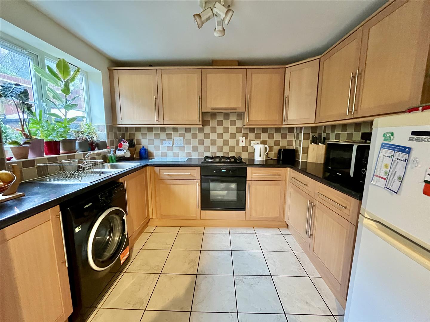 Kitchen - 3.00m x 2.39m (9'10 x 7'10) - Contemporary wall and base level units with laminate worktops and tiled splashbacks, integral electric oven, gas hob, extractor hood above, space and plumbing for a washing machine, space for a fridge/freezer. Rear aspect window overlooks the garden, tiled floor.