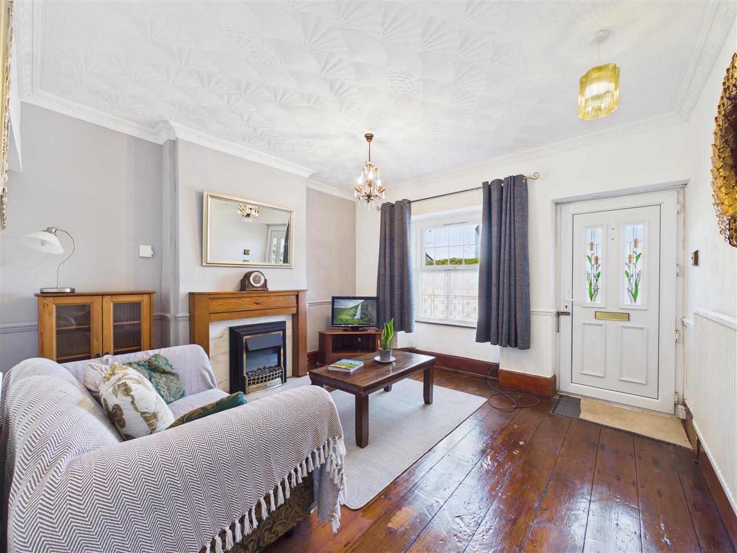 Lounge - 3.56m x 3.73m (11'8 x 12'3) - Two ceiling lights, coving, chimney breast, alcoves to either side, dado rail, thermostat controls, electric fire, deep timber skirting boards, exposed timber floorboards, tv point, power points, single radiator, front aspect upvc double glazed Georgian bar window overlooking Tusculum Way and towards fields and woodland in the distance, bifold door giving access into: