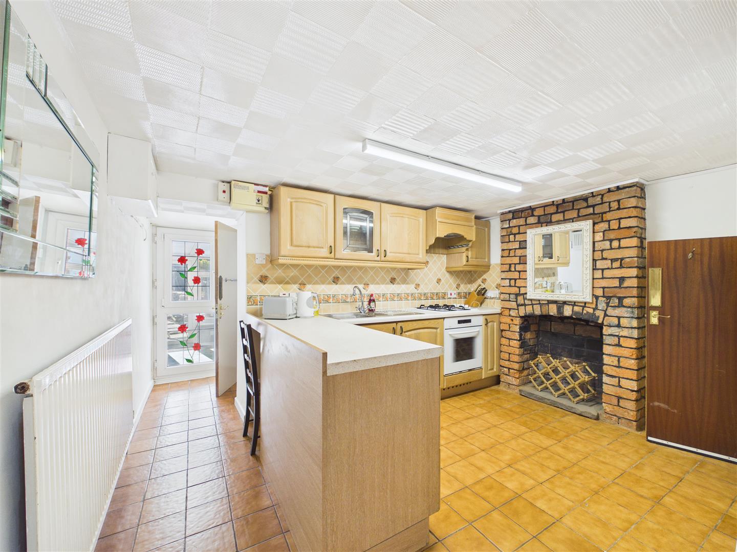 Kitchen - 3.38m x 3.68m (11'1 x 12'1) - Ceiling light, single bowl, single drainer stainless steel sink unit with mixer tap over, rolled edge worktops, tiled surrounds, range of base and wall mounted units, electric oven, gas hob, filter hood over, consumer unit, tiled flooring, stairs leading to the first floor, power points, single radiator, feature brick fireplace opening with stone hearth, door leading to: