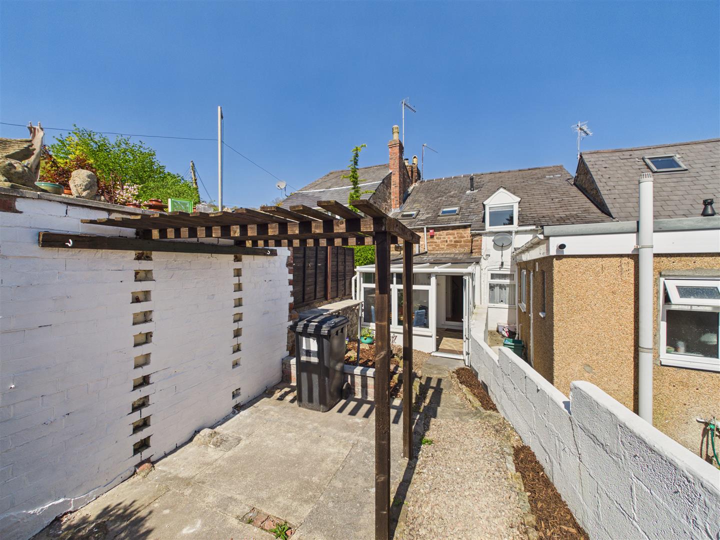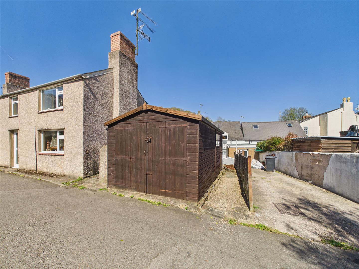 Outside - Paved pathway with flower borders to the side leads along to the rear garden with pagoda seating space, further raised garden areas, enclosed by stone walling and fencing, large timber shed/workshop with power, lighting and bifold door which could make it suitable as a garage.