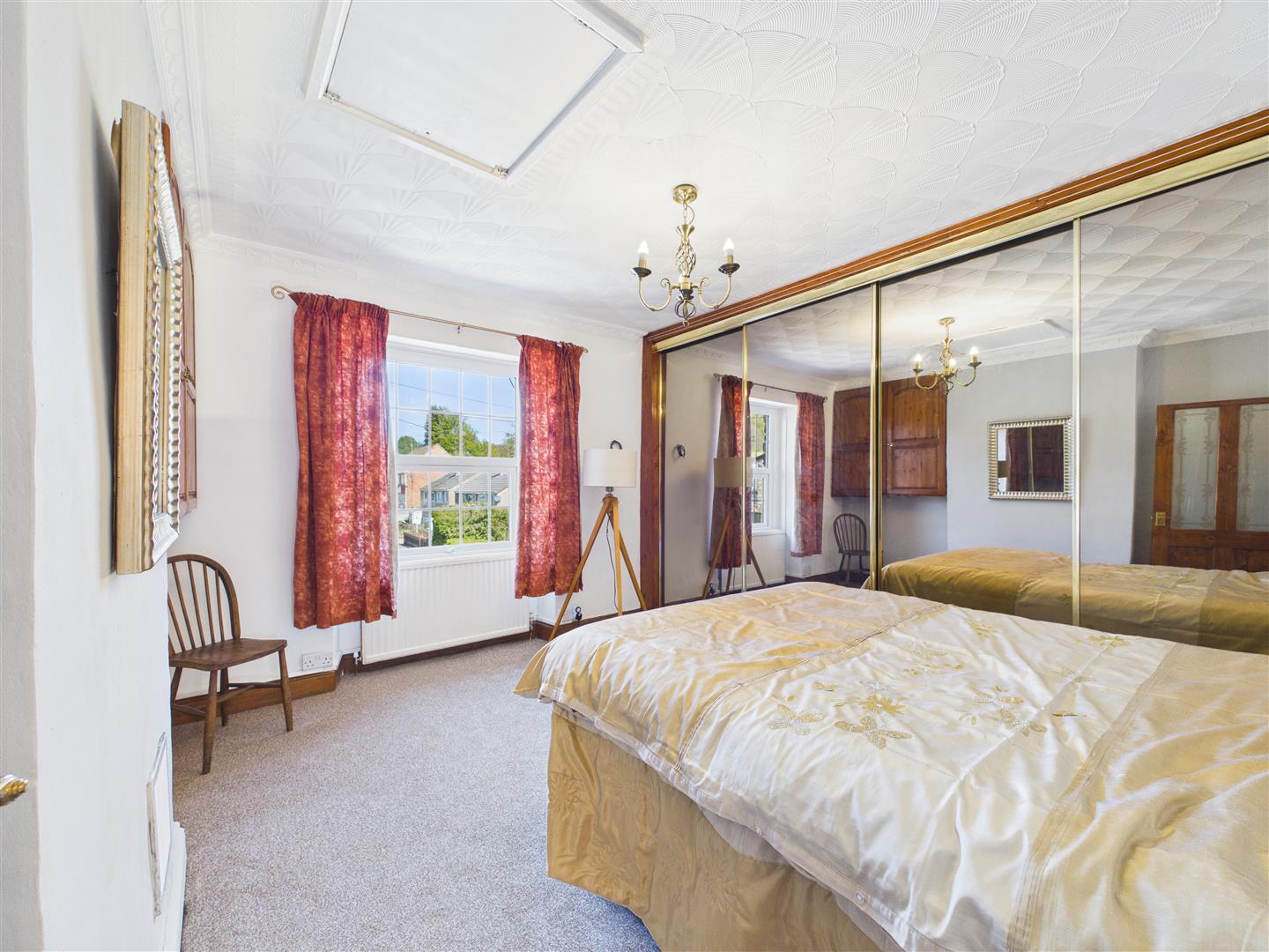 Bedroom One - 3.84m x 3.07m (12'7 x 10'1) - Ceiling light, access to roof space, large range of built-in wardrobes with mirrored doors, hanging and shelving options, chimney breast, alcove cupboard to side, two wooden doors with shelving, power points, double radiator, front aspect upvc Georgian bar double glazed window with views up Tusculum Way and towards fields and woodland in the distance.