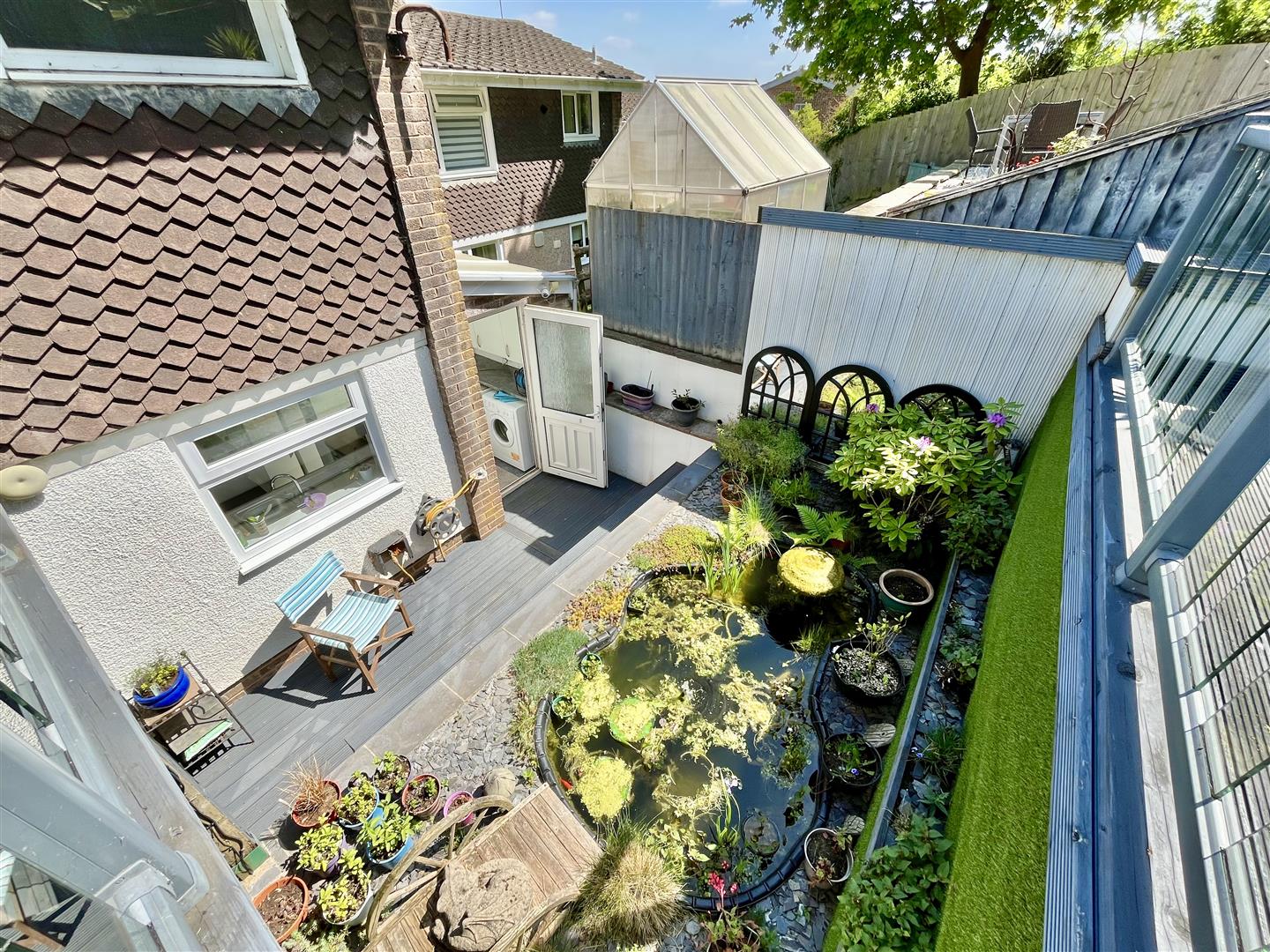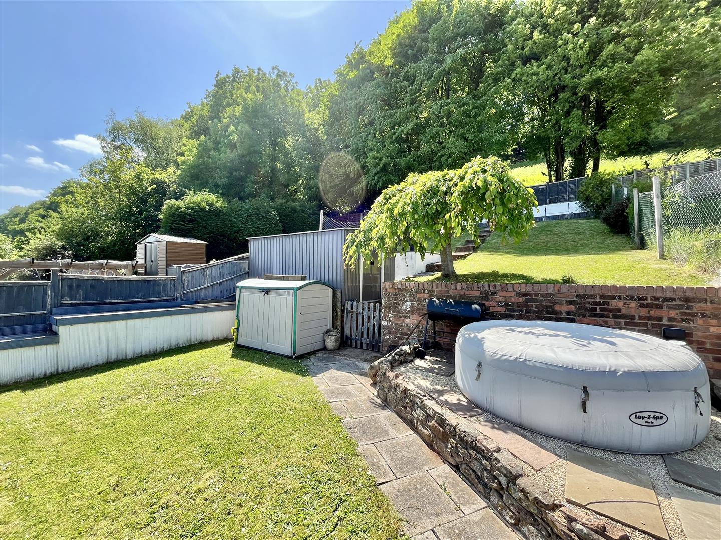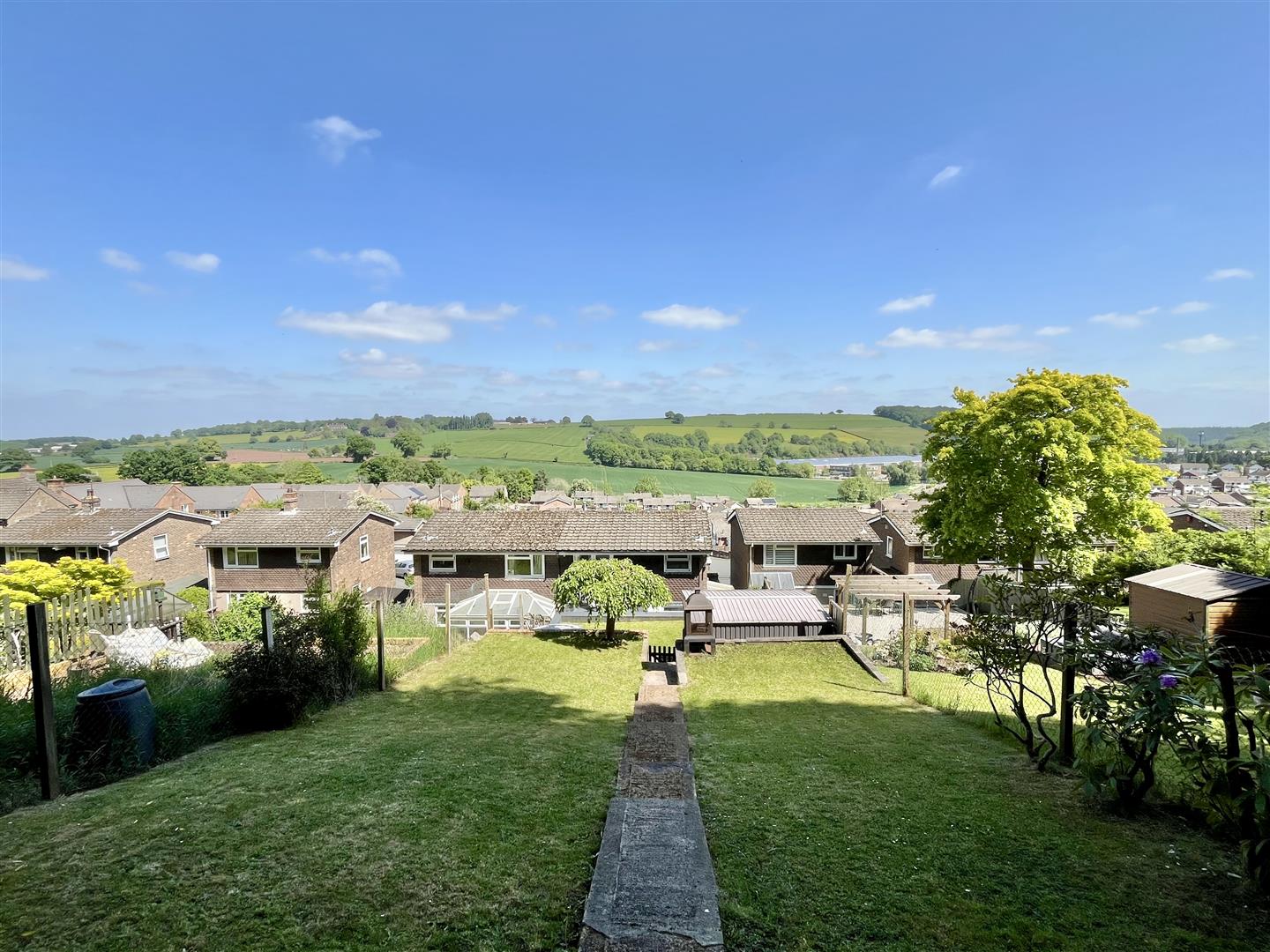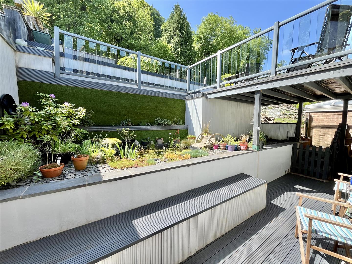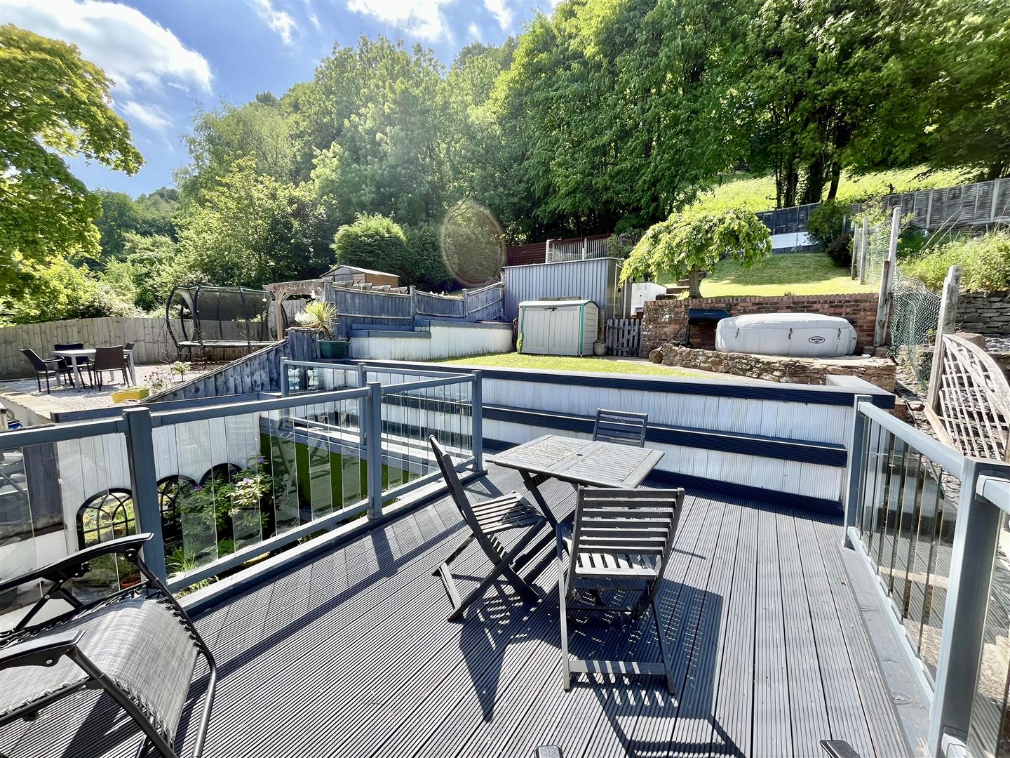 The generously sized, terraced rear garden features a sheltered patio area directly behind the property, complete with an attractive raised pond and water feature. Steps ascend to a decked balcony, which is also accessible from the second bedroom. From here, you can reach the rest of the predominantly lawned garden, offering space for a hot tub, a shed, and direct access to woodland walks beyond. At the top of the garden, you'll find truly breath-taking panoramic views across Mitcheldean and the surrounding landscape.