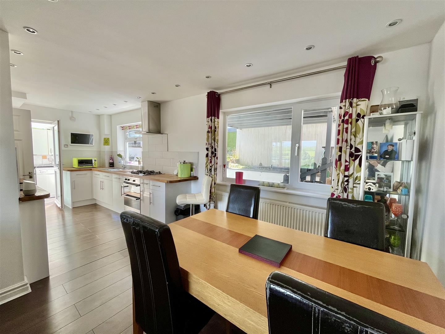 Kitchen/Diner - 6.32m x 2.54m (20'09 x 8'04) - Comprising contemporary wall and base mounted units with solid oak worktops with tiled splash backs and inset 1.5 bowl stainless steel sink unit with drainer. Integral electric double oven with gas hob and extractor hood over. Space for a fridge/freezer. Laminate wood flooring, radiator, two rear aspect windows. Door into;