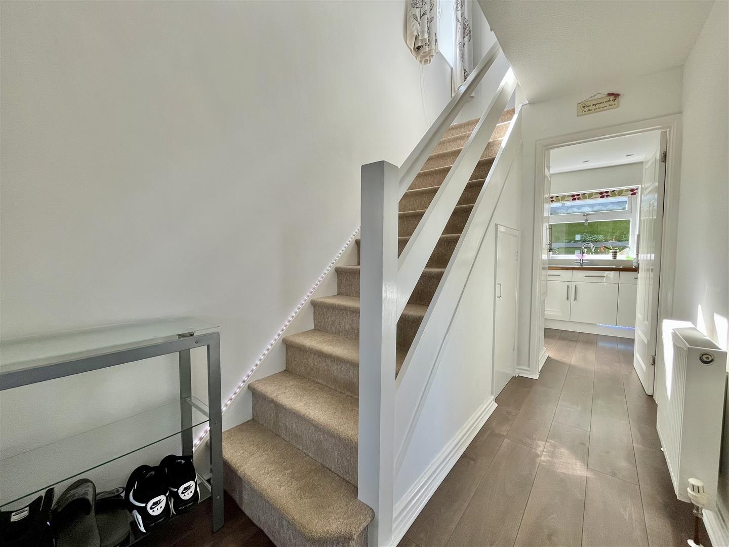 Entrance Hall - Radiator, laminate wood flooring, stairs lead to the first floor with storage cupboard under, doors lead off to the lounge and kitchen/diner.