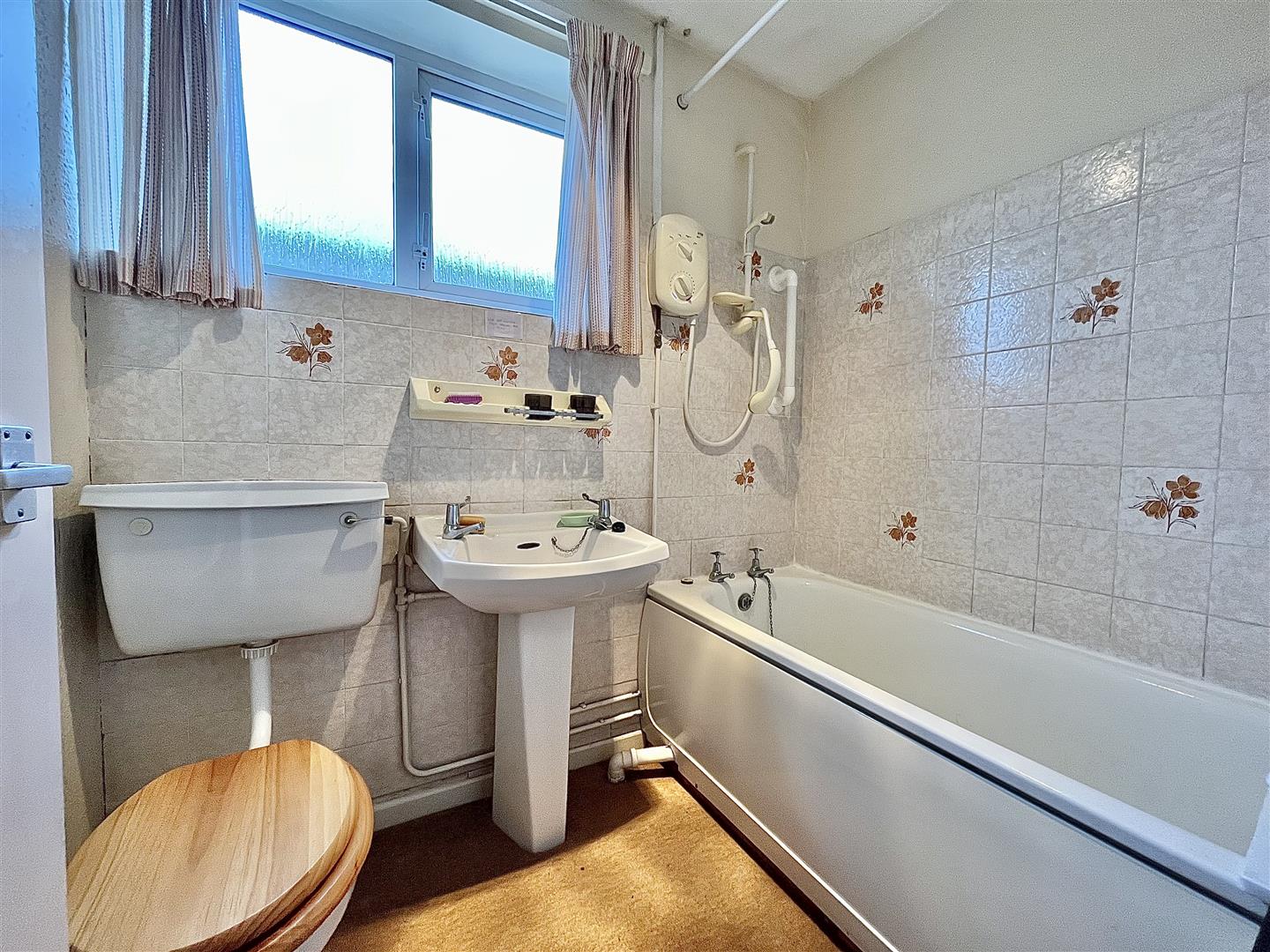Bathroom - 1.98m x 1.70m (6'06 x 5'07) - Bath with electric shower over and tiled surround, close coupled w.c, pedestal washbasin, obscured side aspect window.