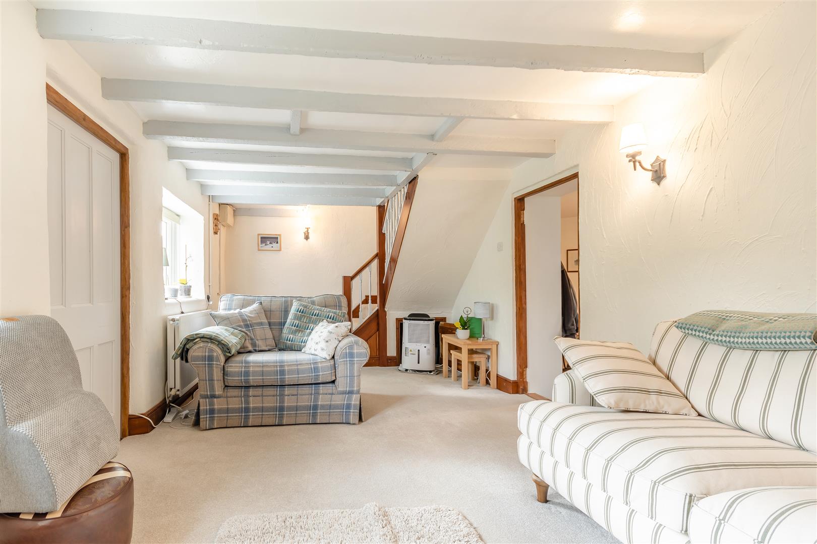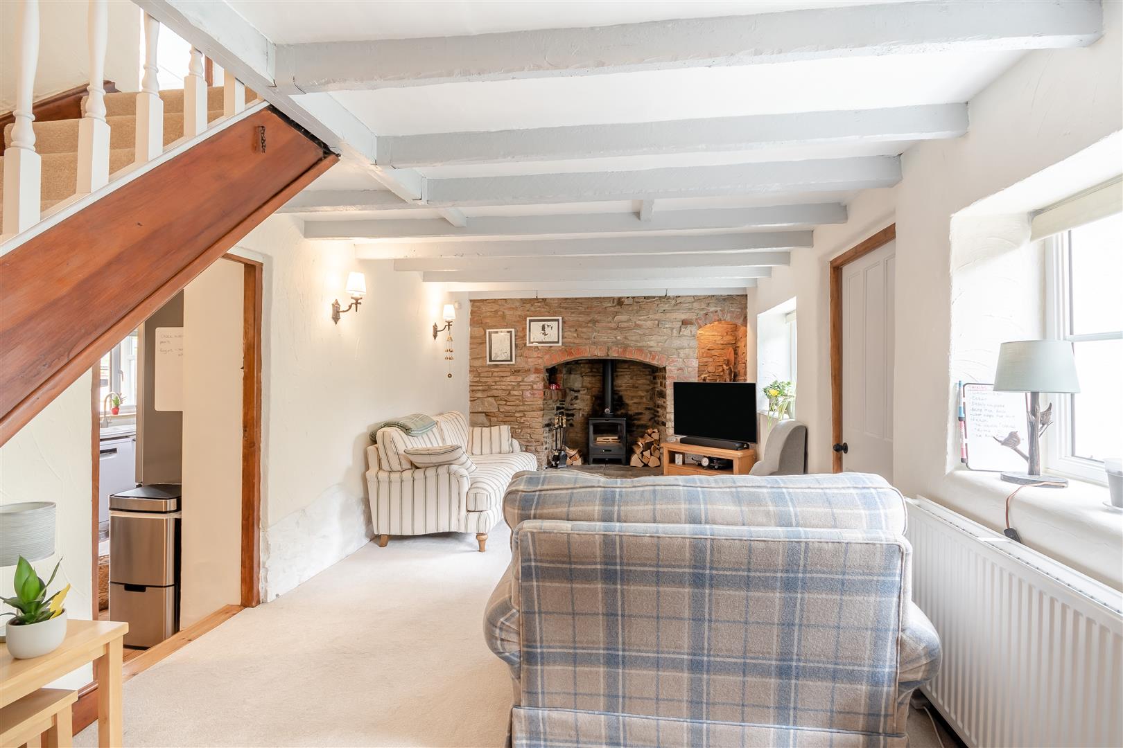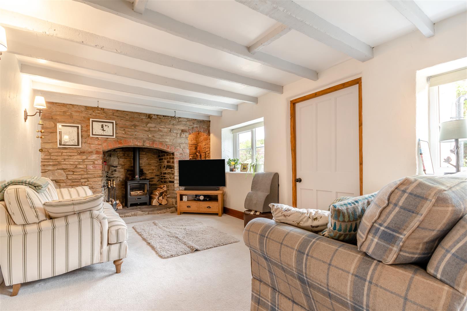 Lounge - 5.97m x 2.97m (19'7 x 9'9) - Gorsley stone fireplace with inset wood burning stove, display shelving, double radiator, exposed timbers, understairs storage cupboard, two front aspect windows, opening leads into:
