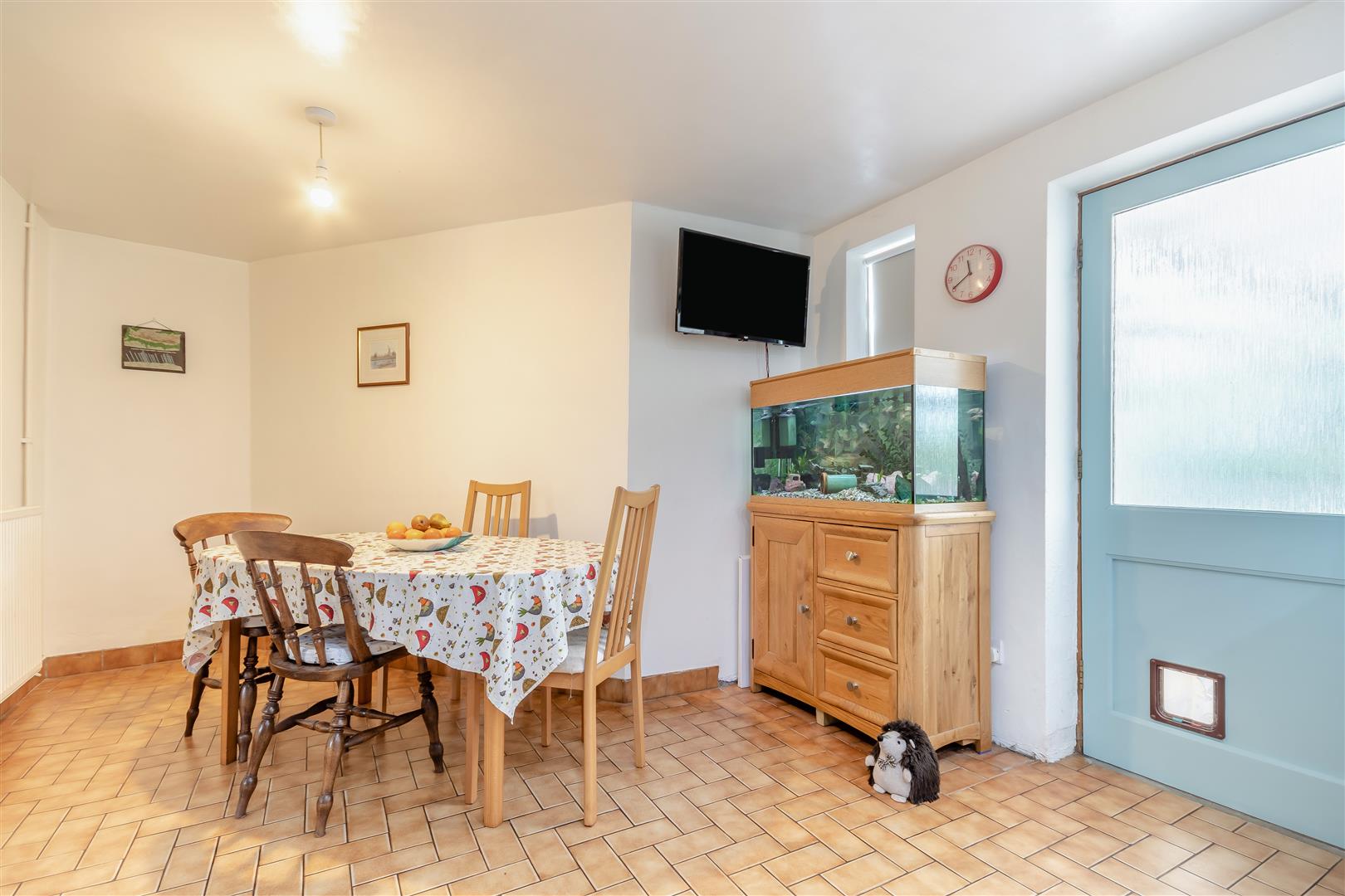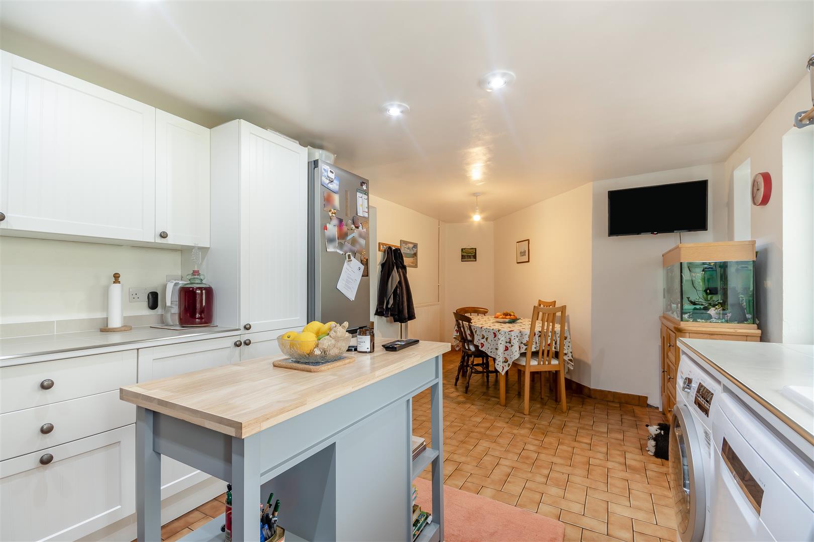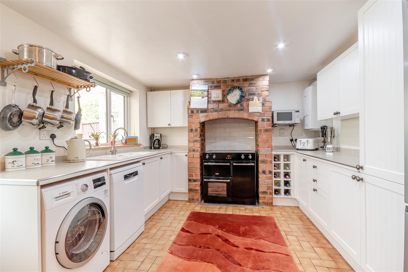 Kitchen / Dining Room - 5.97m x 3.28m (19'7 x 10'9) - Fitted kitchen to comprise one and a half bowl single drainer sink unit with mixer tap, cupboards under, range of base and wall mounted units, space for cooking range, plumbing for washing machine and dishwasher, space for fridge / freezer, feature brick fireplace, double radiator, tiled flooring, wine rack, two front aspect windows.