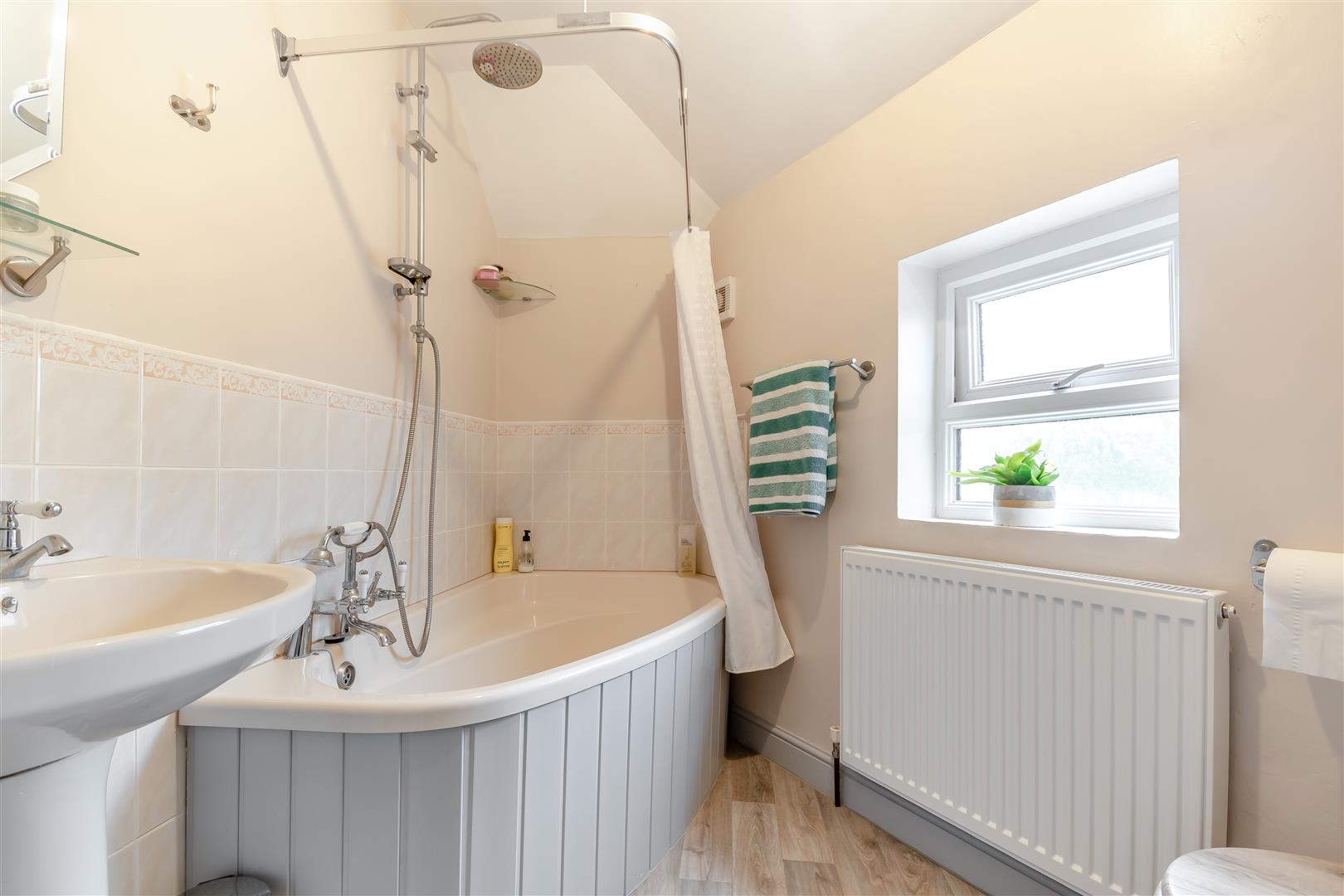 Bathroom - Corner bath with shower attachment over, pedestal wash hand basin with tiled splashback, close coupled WC, single radiator, rear aspect frosted window.