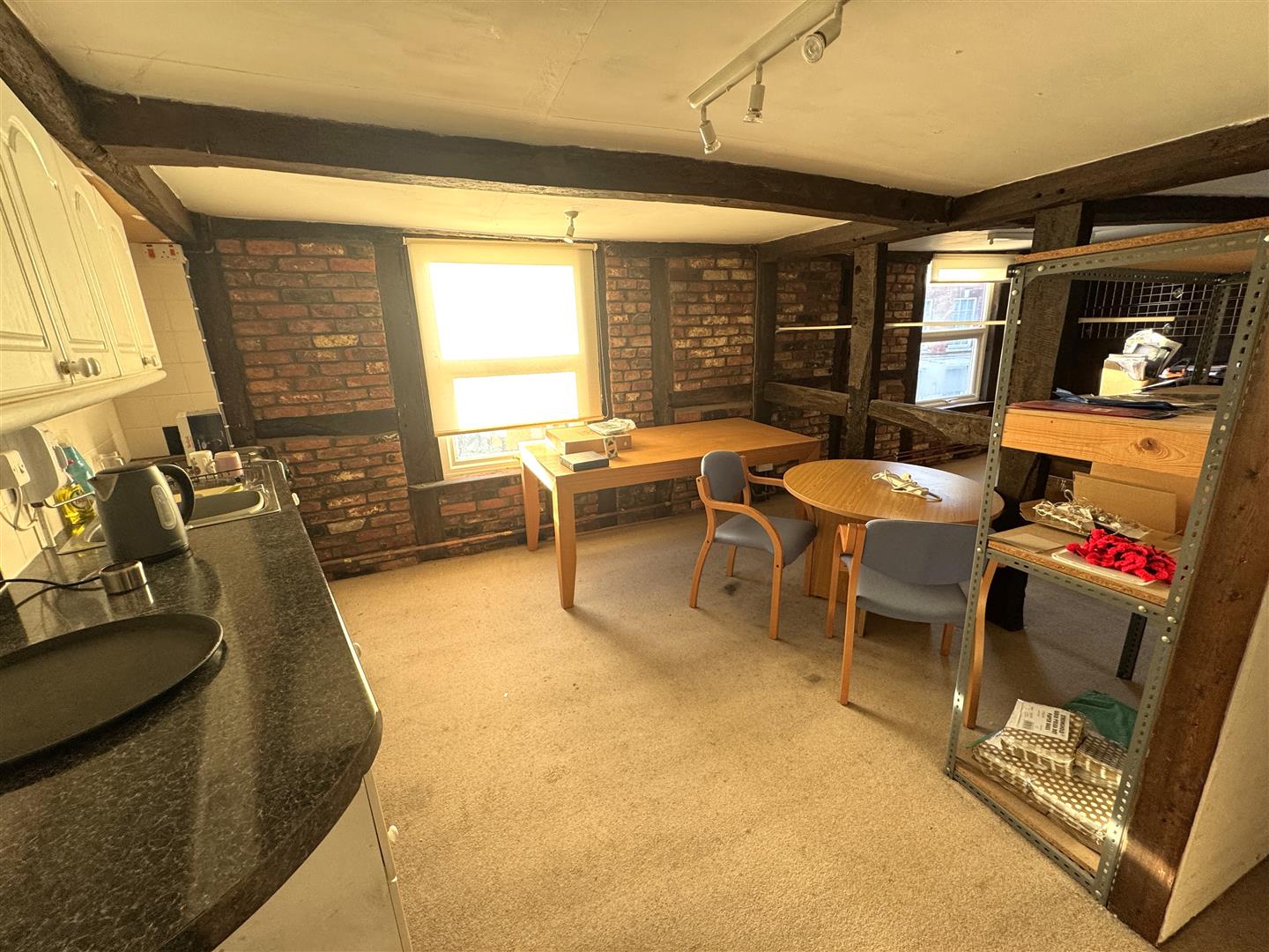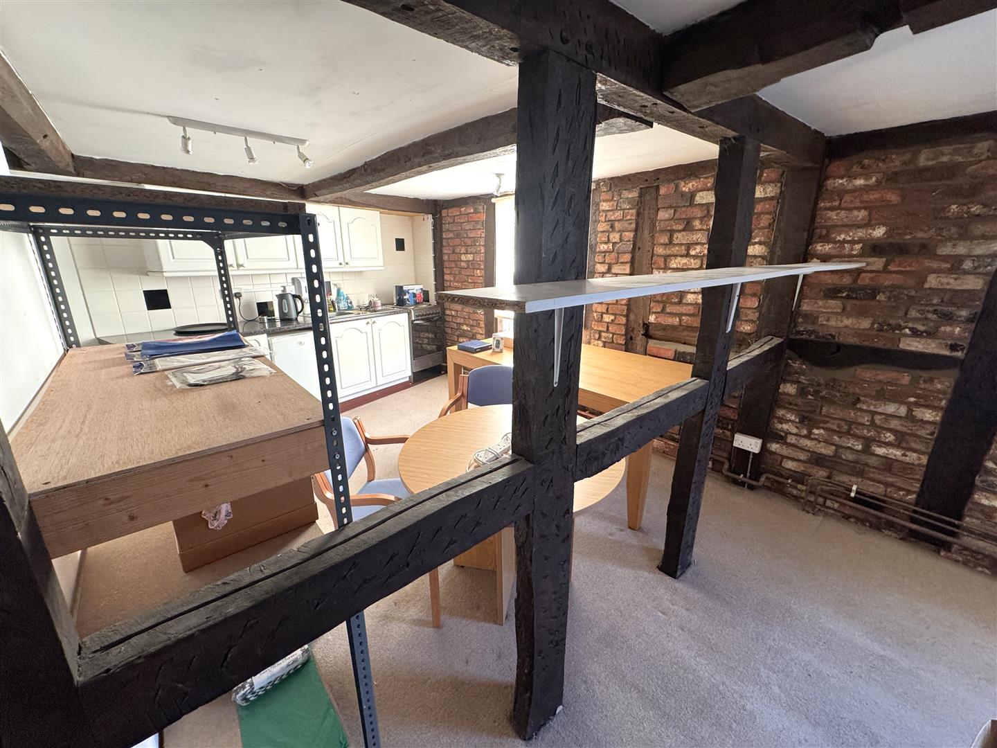 Kitchen Area - The kitchen comprising one and a half bowl single drainer sink unit, cupboards under, base and wall mounted units, fully exposed timbers and brickwork.