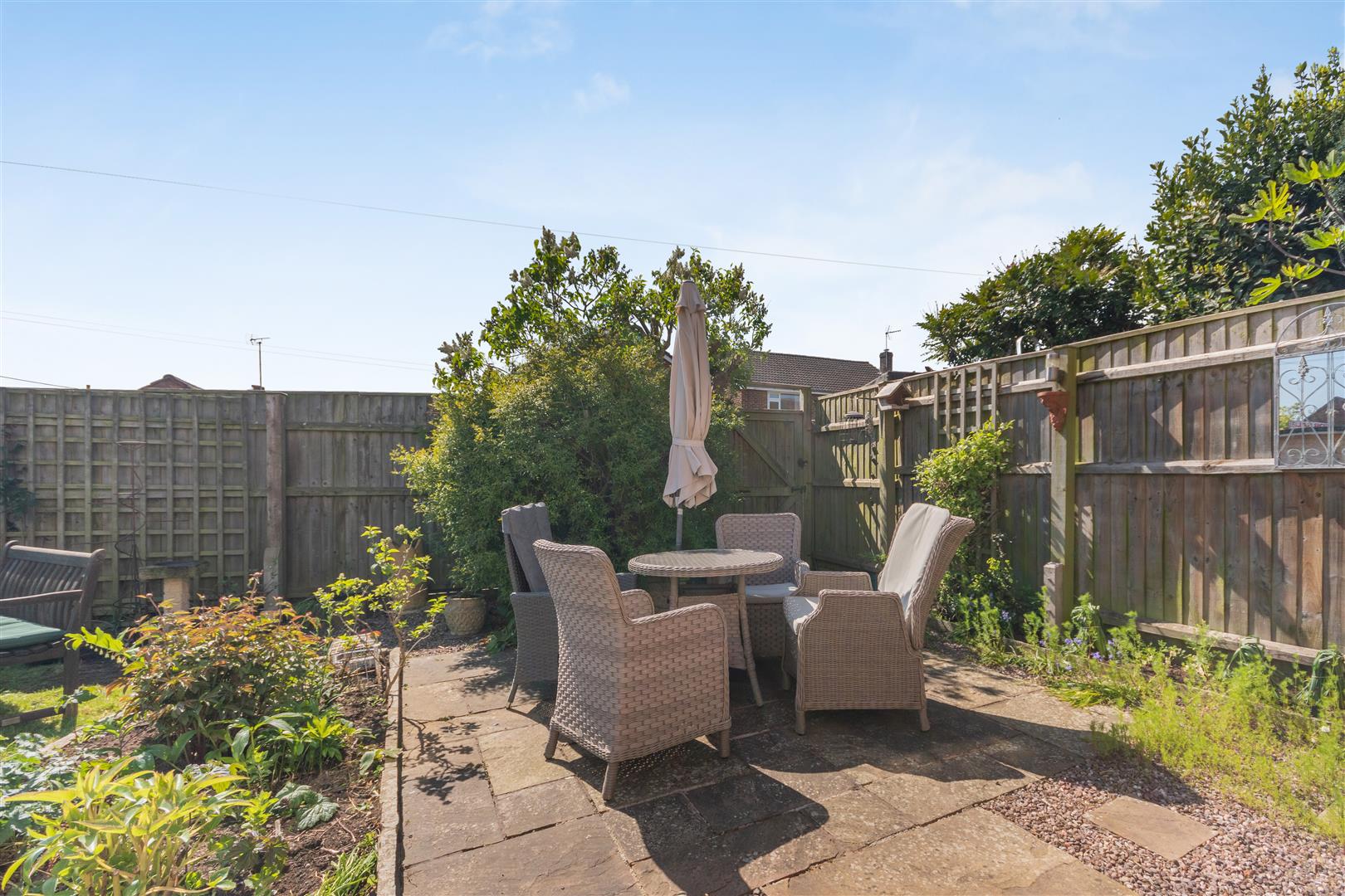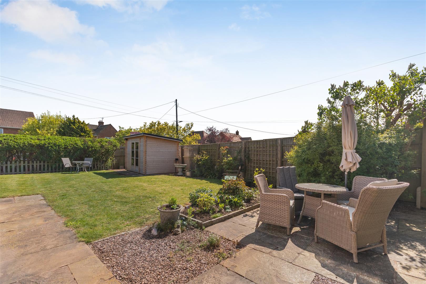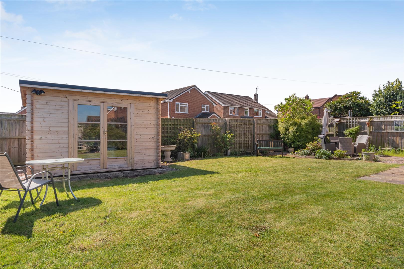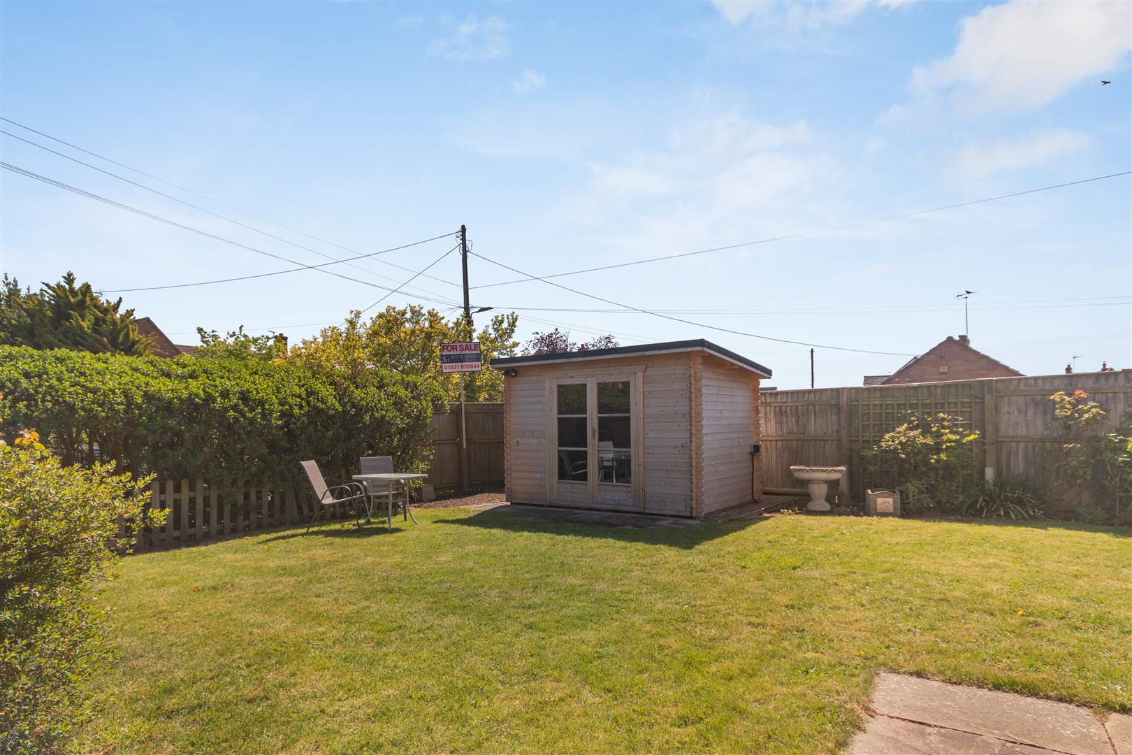 A pathway leads to left hand side of the property, where the garden wraps around and is predominantly laid to lawn with flower borders and hedging. There is a patio / seating area, personal gate onto the pavement, bin store to the rear, all enclosed by fencing and hedging. There is a SUMMER HOUSE with power and lighting, accessed via double wooden doors.