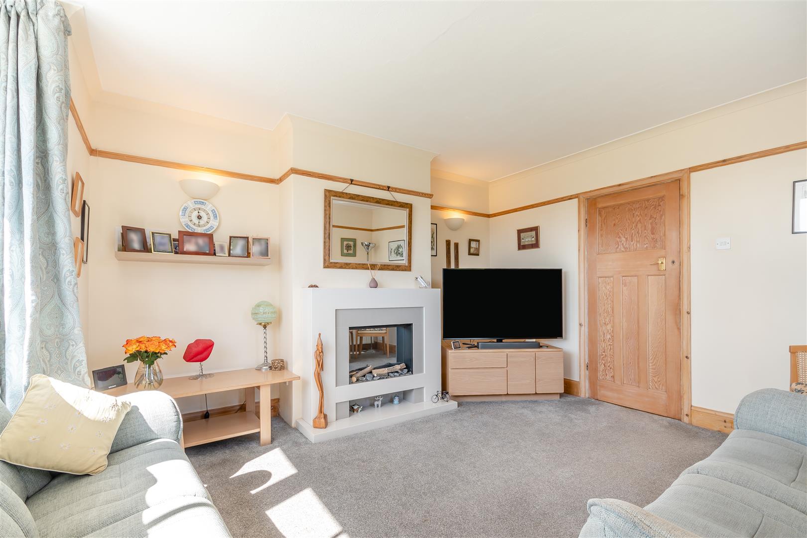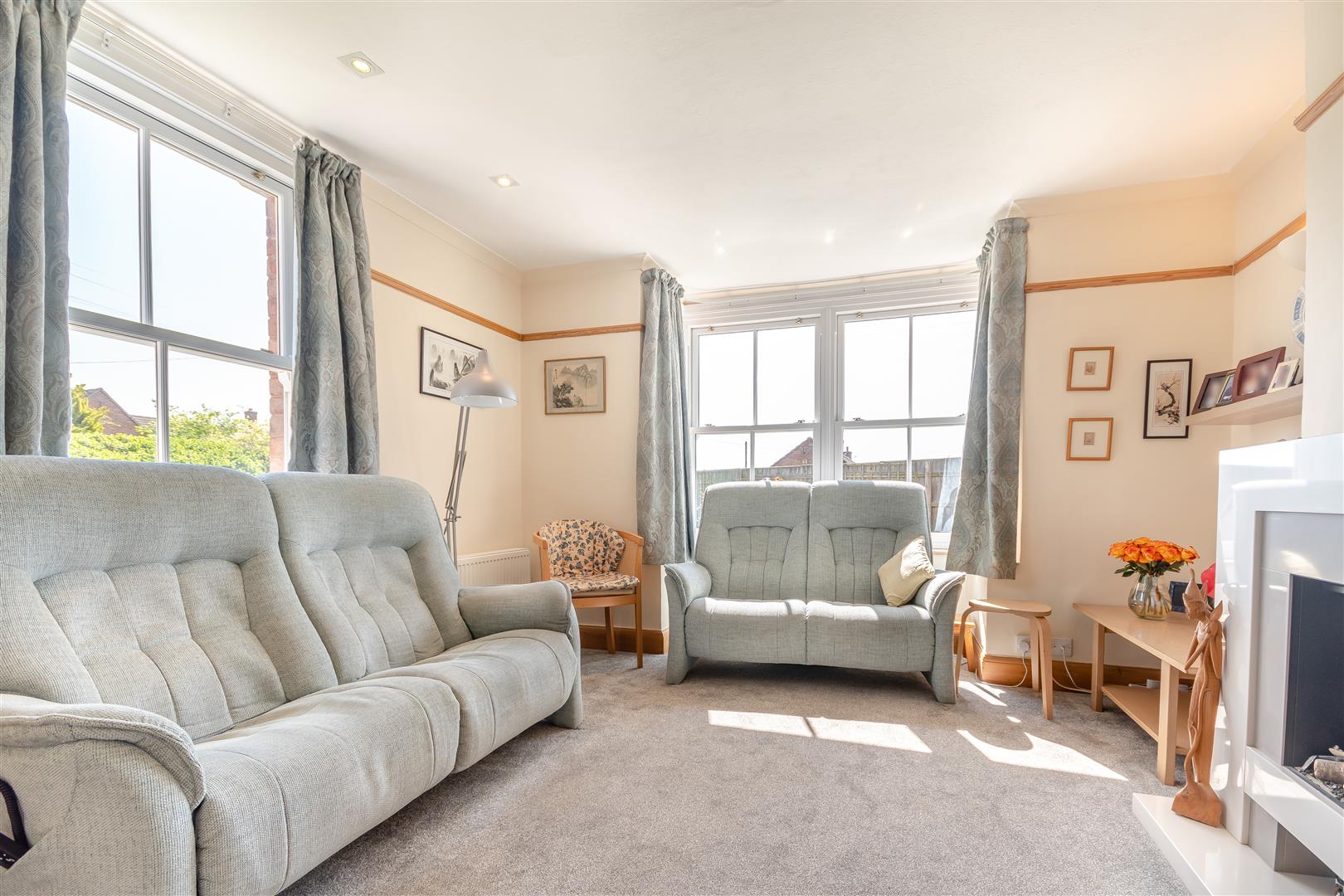 Living Room - 4.04m x 3.84m (13'3 x 12'7) - Electric fire with marble effect surround (NOTE - the original fireplace is behind and could be opened up), radiator, television point, picture rail, coving, front aspect sash window, side aspect bay window incorporating four sash windows overlooking the side garden.