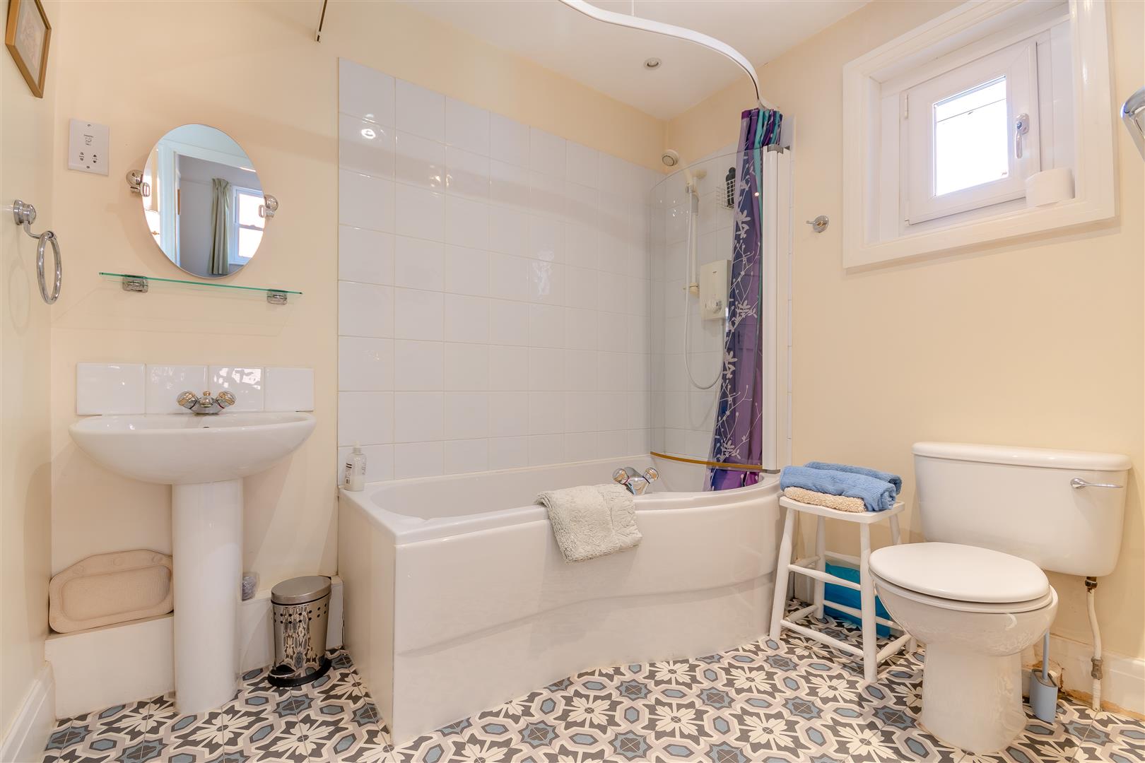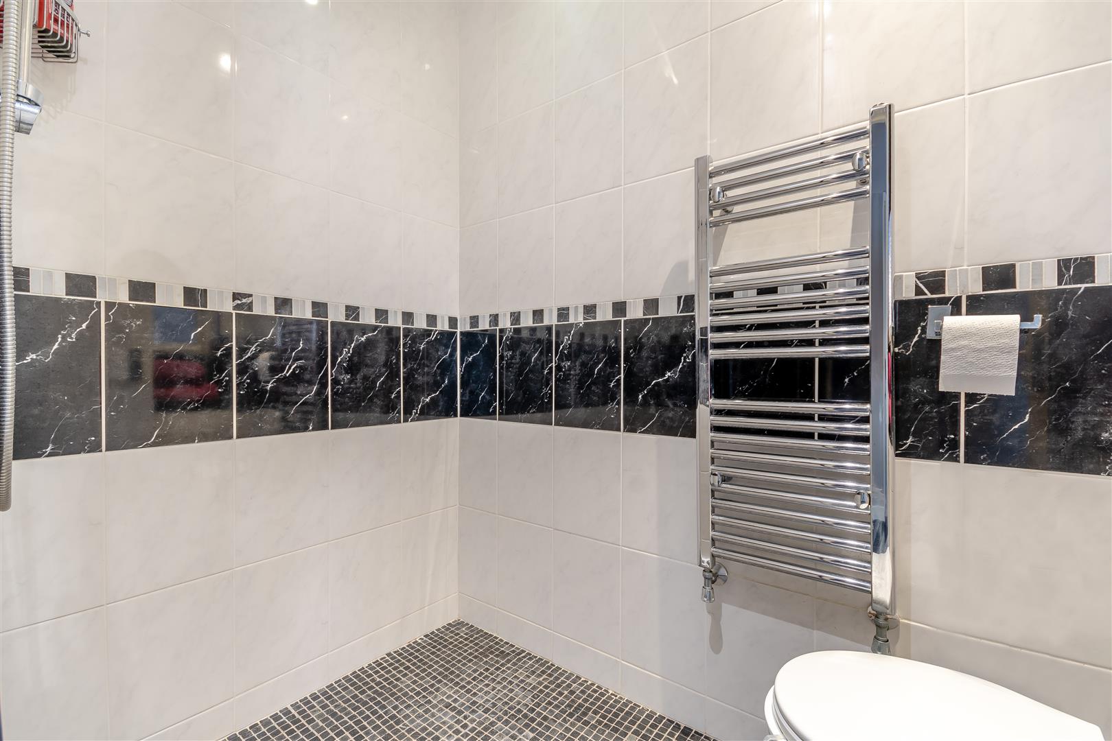 Wet Room - Tiled flooring, shower over, fully tiled walls, low-level WC, wash hand basin with cupboard below, extractor fan, heated towel rail, original glazed wooden window looking into the garage.