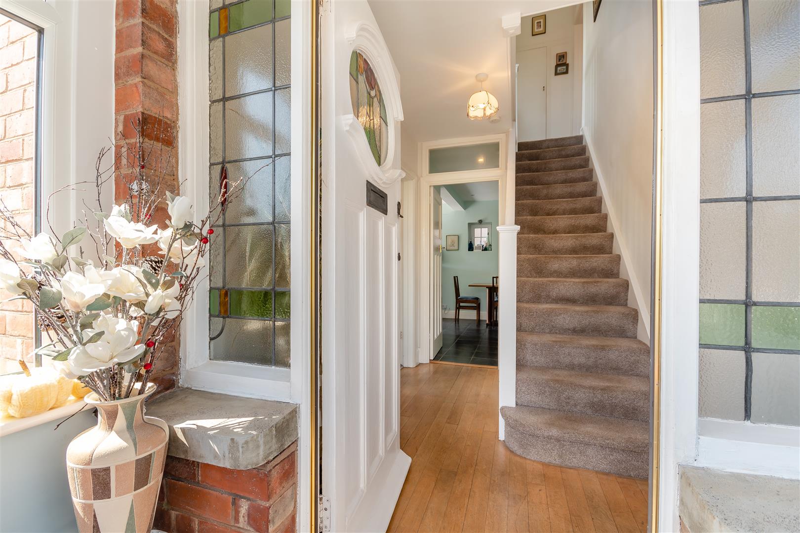 Entrance Porch - Tiled flooring, original wooden door with stained glass window and original stained glass windows surrounding, large front aspect UPVC double glazed windows.
