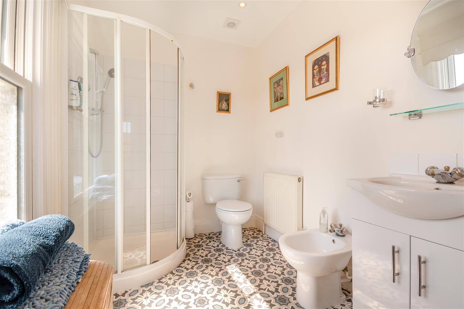 En-Suite - 2.36m x 1.85m (7'9 x 6'1) - Corner shower cubicle, fully tiled walls, low-level WC, bidet, wash hand basin with cupboards below, inset ceiling lights with extractor fan, side aspect part frosted sash window.