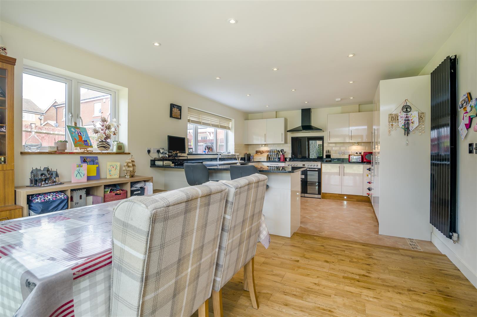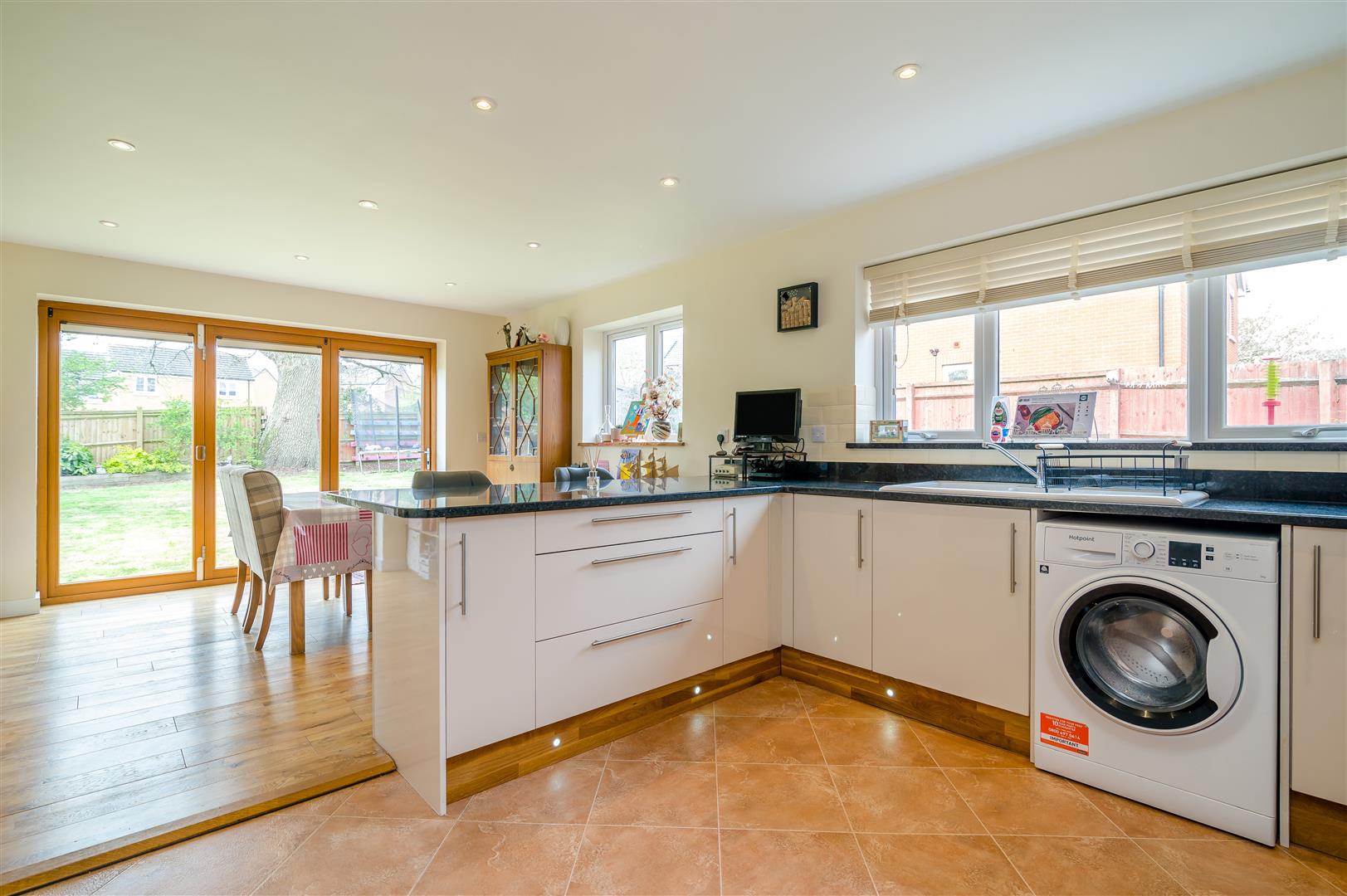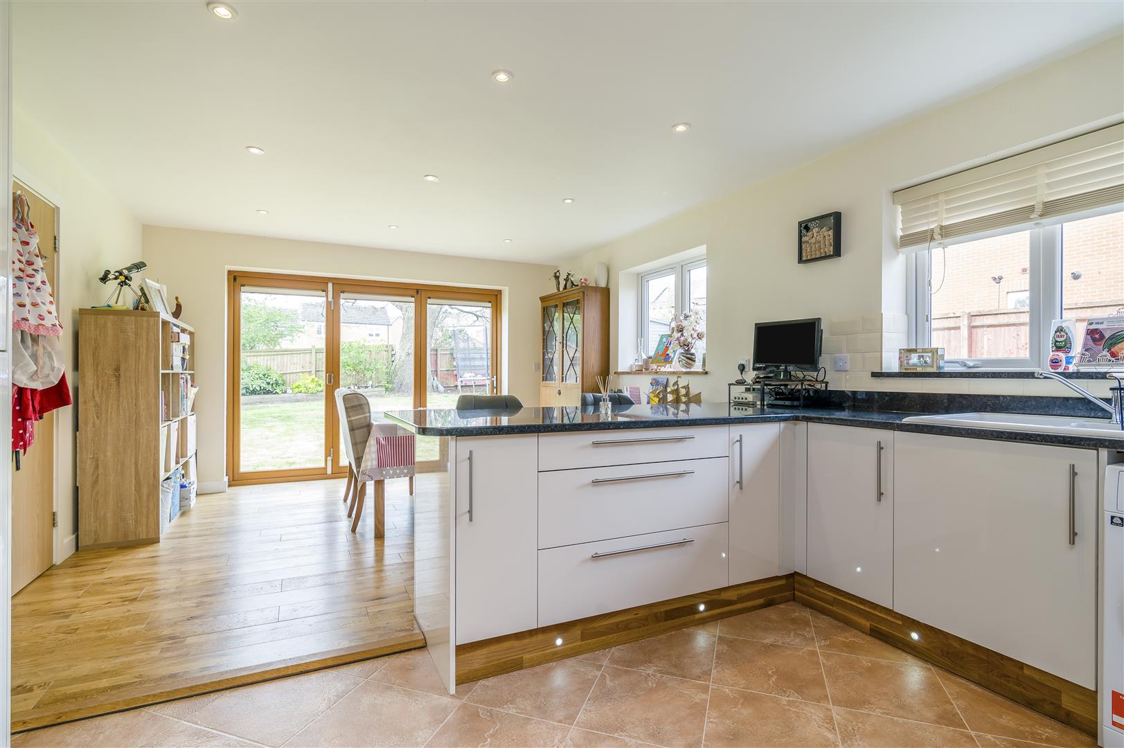Kitchen / Dining / Family Room - 6.81m x 3.86m (22'4 x 12'8) - The kitchen comprises of a range of base and wall mounted units with granite work surfaces, one and a half bowl Belfast sink unit with mixer tap, plumbing for washing machine, integrated fridge / freezer, integrated dishwasher, under counter water softenener, Cuisine Master five ring range oven with extractor fan over, under unit spotlighting, ceiling spotlighting, kick board level lighting, two rear aspect windows, side aspect bi-folding doors to the gardens, modern panelled radiator. The dining area has engineered oak flooring.