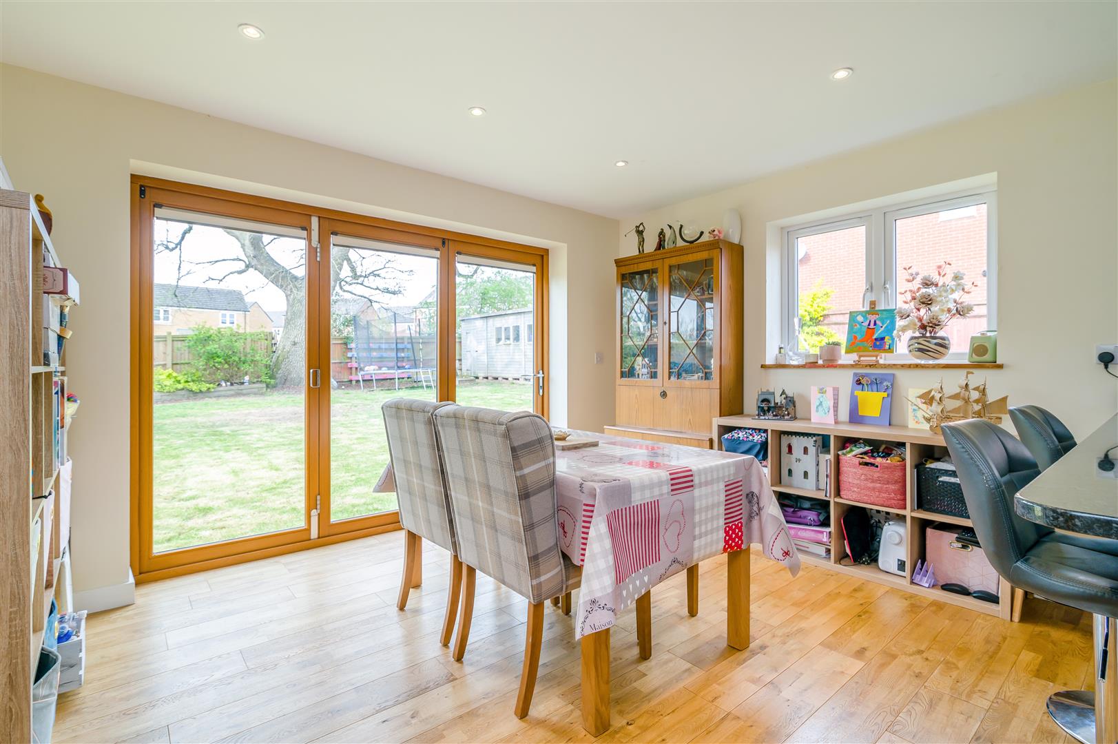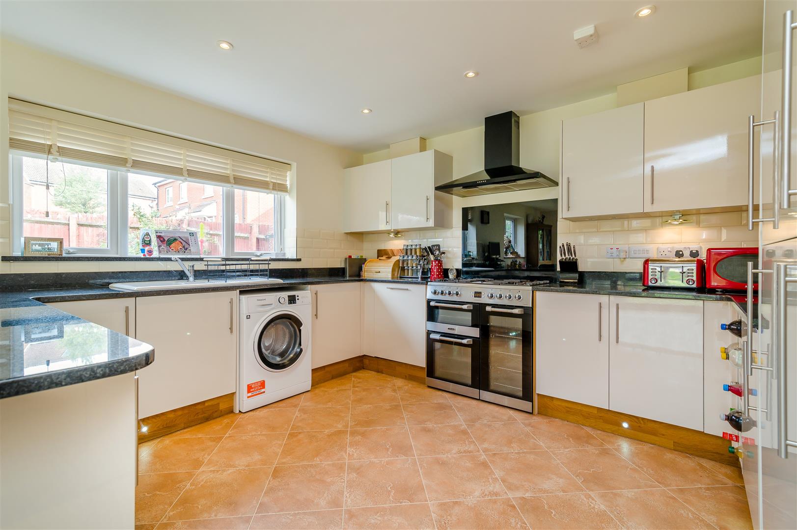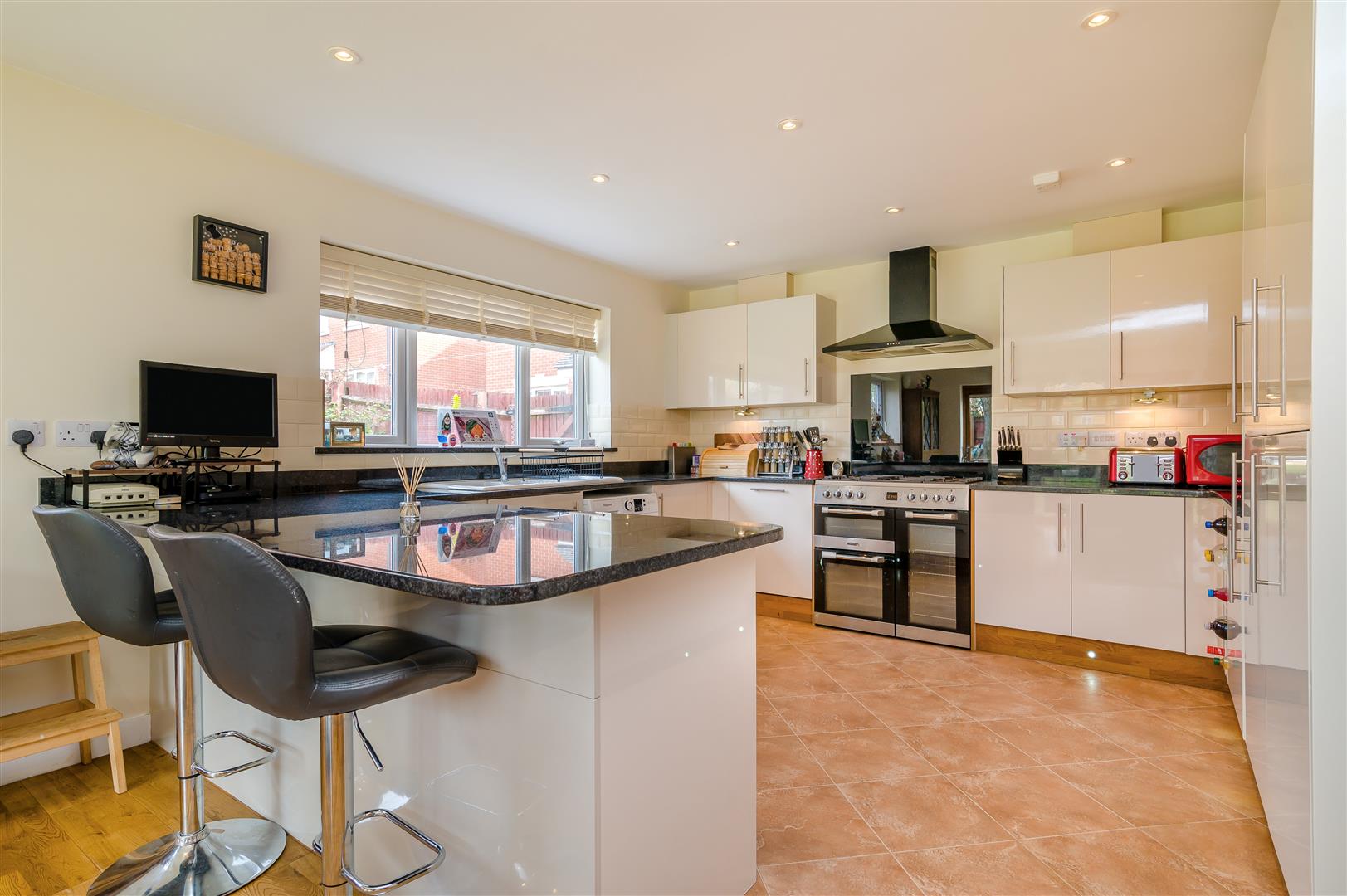 Kitchen / Dining / Family Room - 6.81m x 3.86m (22'4 x 12'8) - The kitchen comprises of a range of base and wall mounted units with granite work surfaces, one and a half bowl Belfast sink unit with mixer tap, plumbing for washing machine, integrated fridge / freezer, integrated dishwasher, under counter water softenener, Cuisine Master five ring range oven with extractor fan over, under unit spotlighting, ceiling spotlighting, kick board level lighting, two rear aspect windows, side aspect bi-folding doors to the gardens, modern panelled radiator. The dining area has engineered oak flooring.