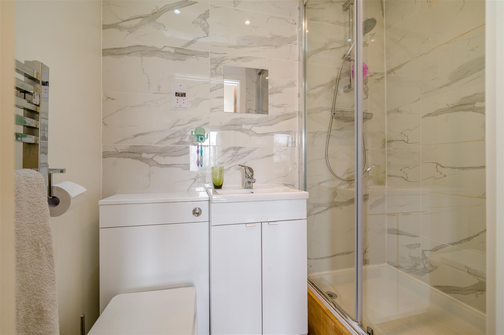 En-Suite - 1.93m x 1.14m (6'4 x 3'9) - Suite comprising walk-in double shower cubicle accessed via sliding glazed screen with inset detachable shower system, vanity wash hand basin with mixer tap and cupboard below, built-in WC, chrome heated towel rail, shaver point, tiled splashbacks, extractor fan, inset spotlighting.