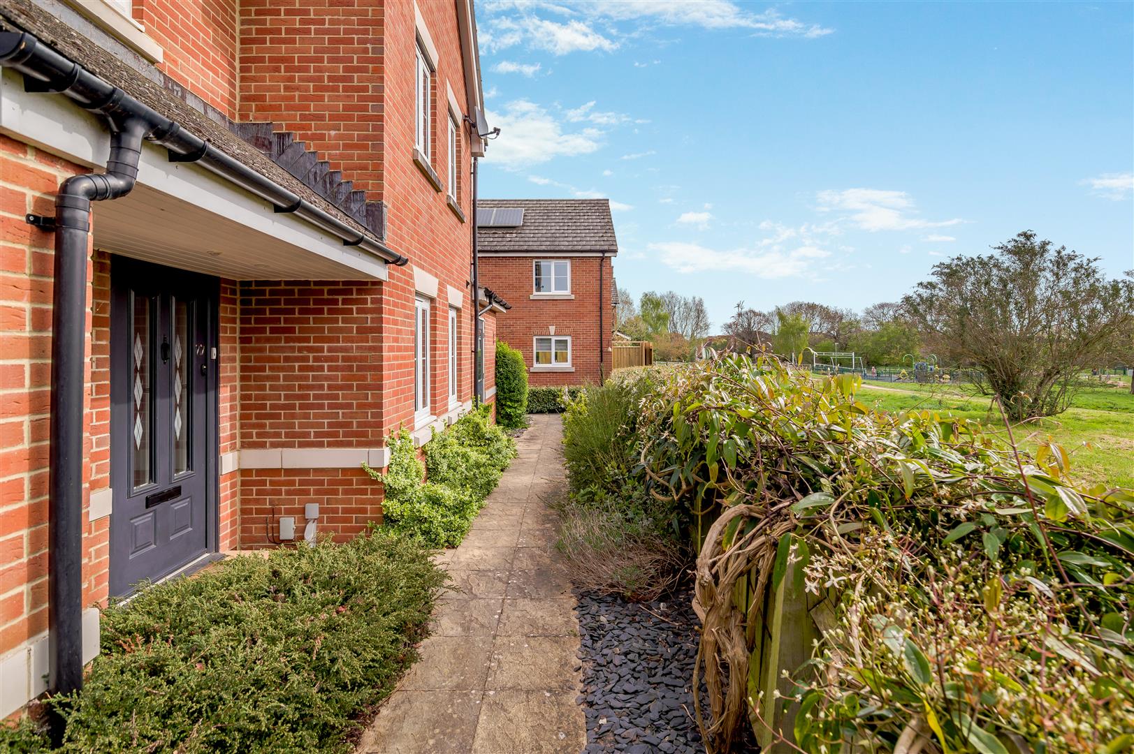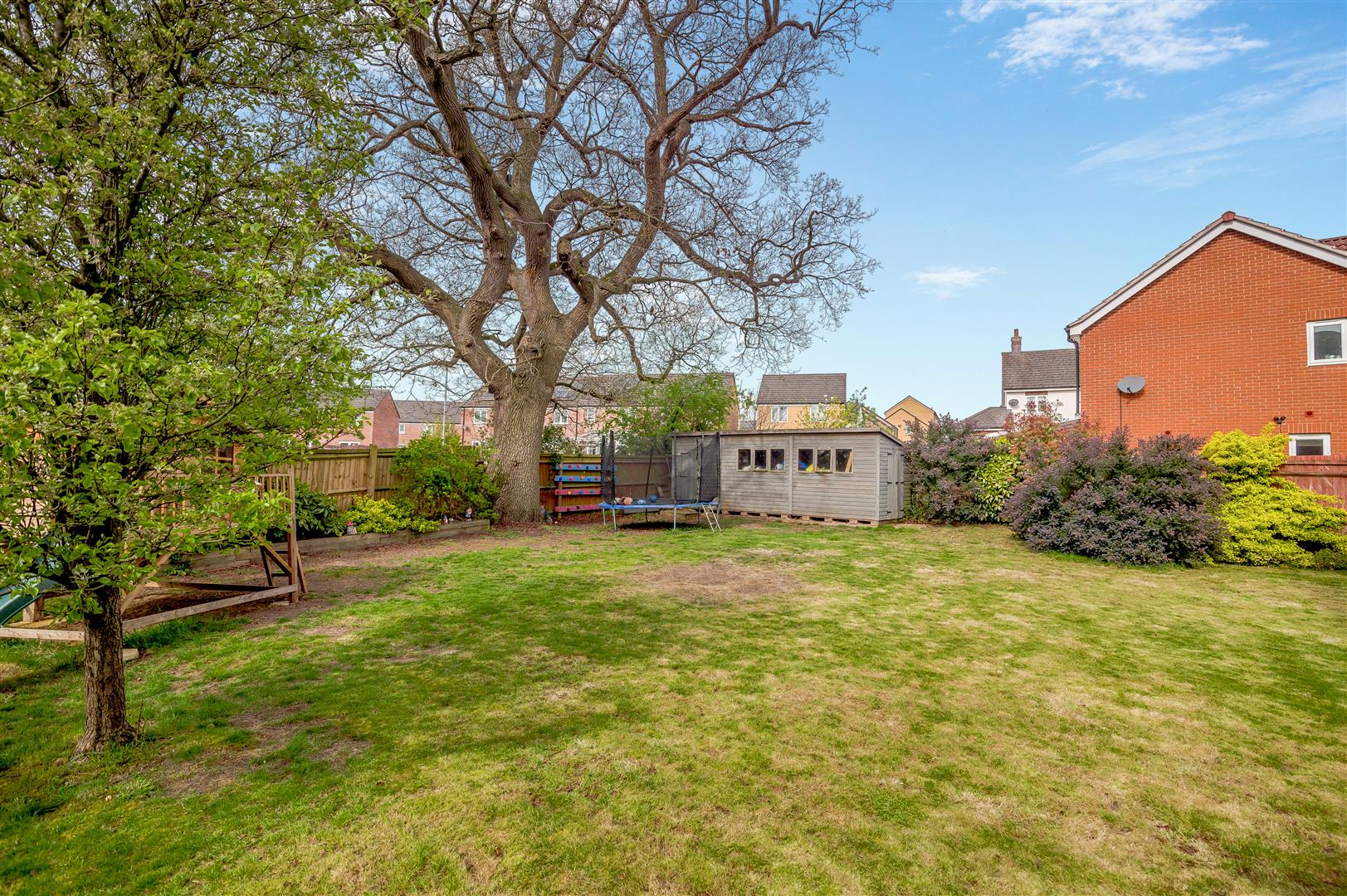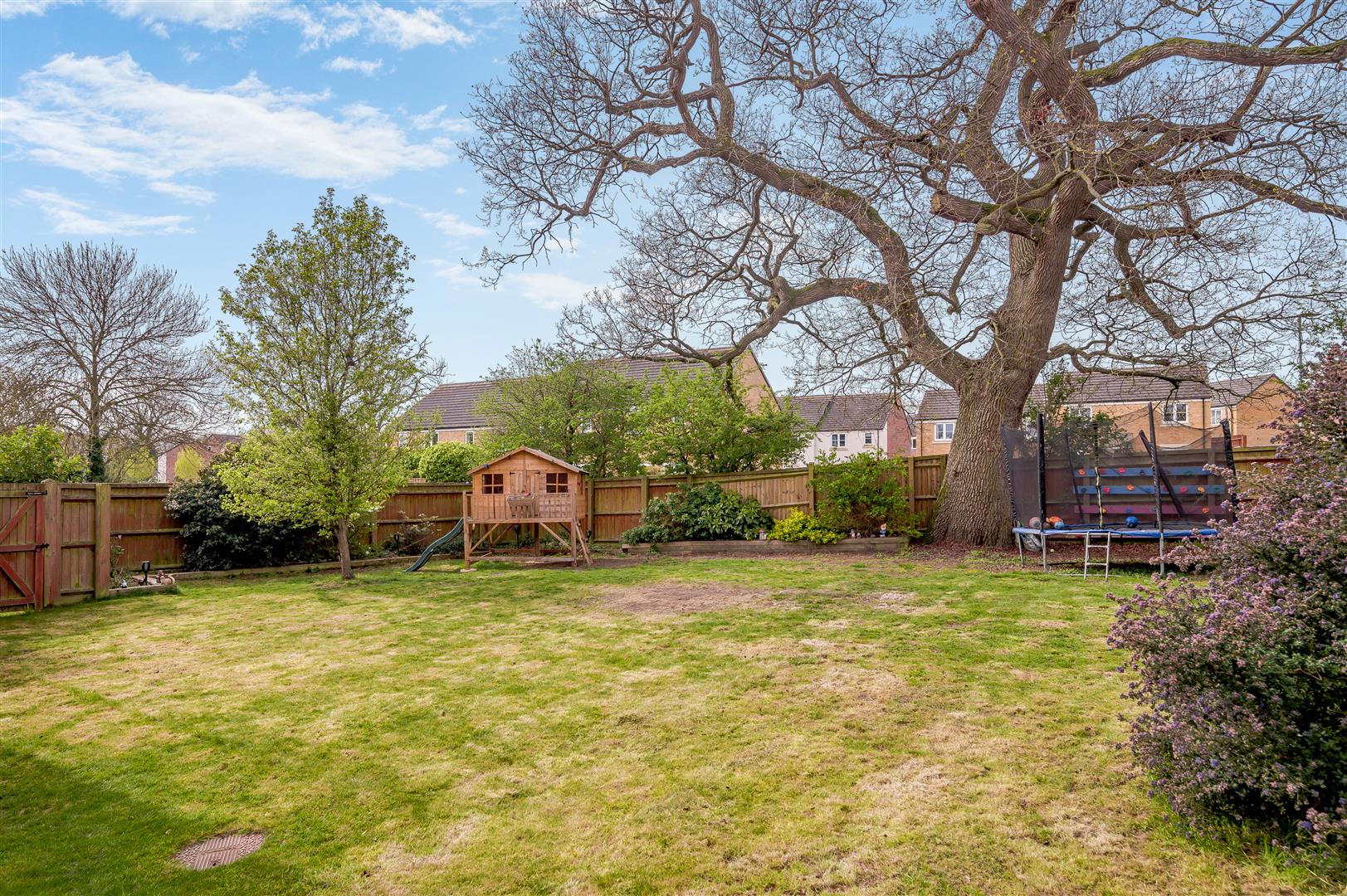 The front garden area is laid to lawn with purple slate. There are further beds planted with shrubs and bushes and it is all enclosed by low fencing, enjoying the views over the open parkland. There is a bin storage area and a canopy area over the front door and gated access to the back garden from the front and side parking area. The property enjoys the largest plot on the entire estate, which is mainly laid to lawn with planted borders, outside lighting, large wooden built workshop, mature Oak tree providing dappled shade on a hot day. The gardens are enclosed by wooden panelled fencing and measure approximately 70' x 70' maximum.
