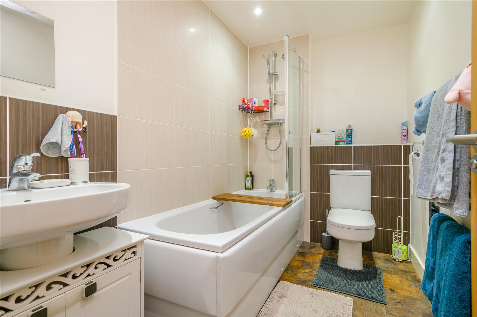 Bathroom - 2.79m x 1.70m (9'2 x 5'7) - Suite comprising panelled bath with inset detachable shower system over, WC, wash hand basin with cupboard below, tiled floor and splashbacks, chrome heated towel rail, extractor fan, inset spotlighting.