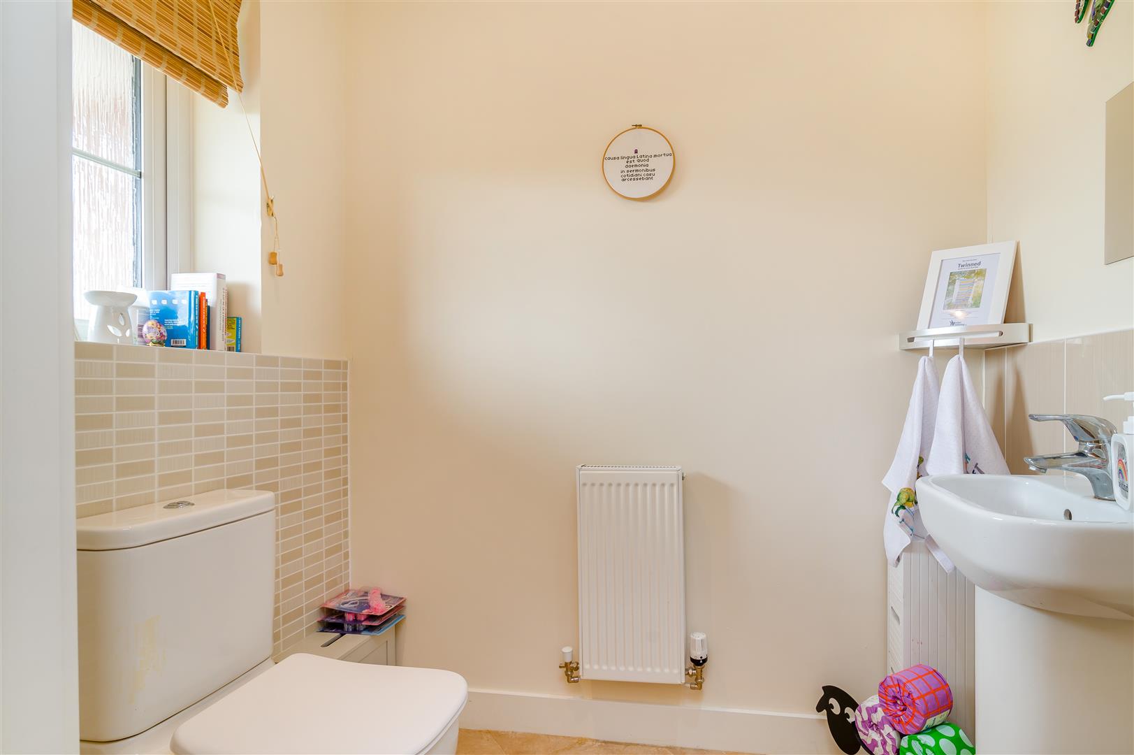 Cloakroom - 1.88m x 1.47m (6'2 x 4'10) - Wash hand basin with mixer tap, WC, single radiator, tiled splashbacks, spotlighting, front aspect frosted window.