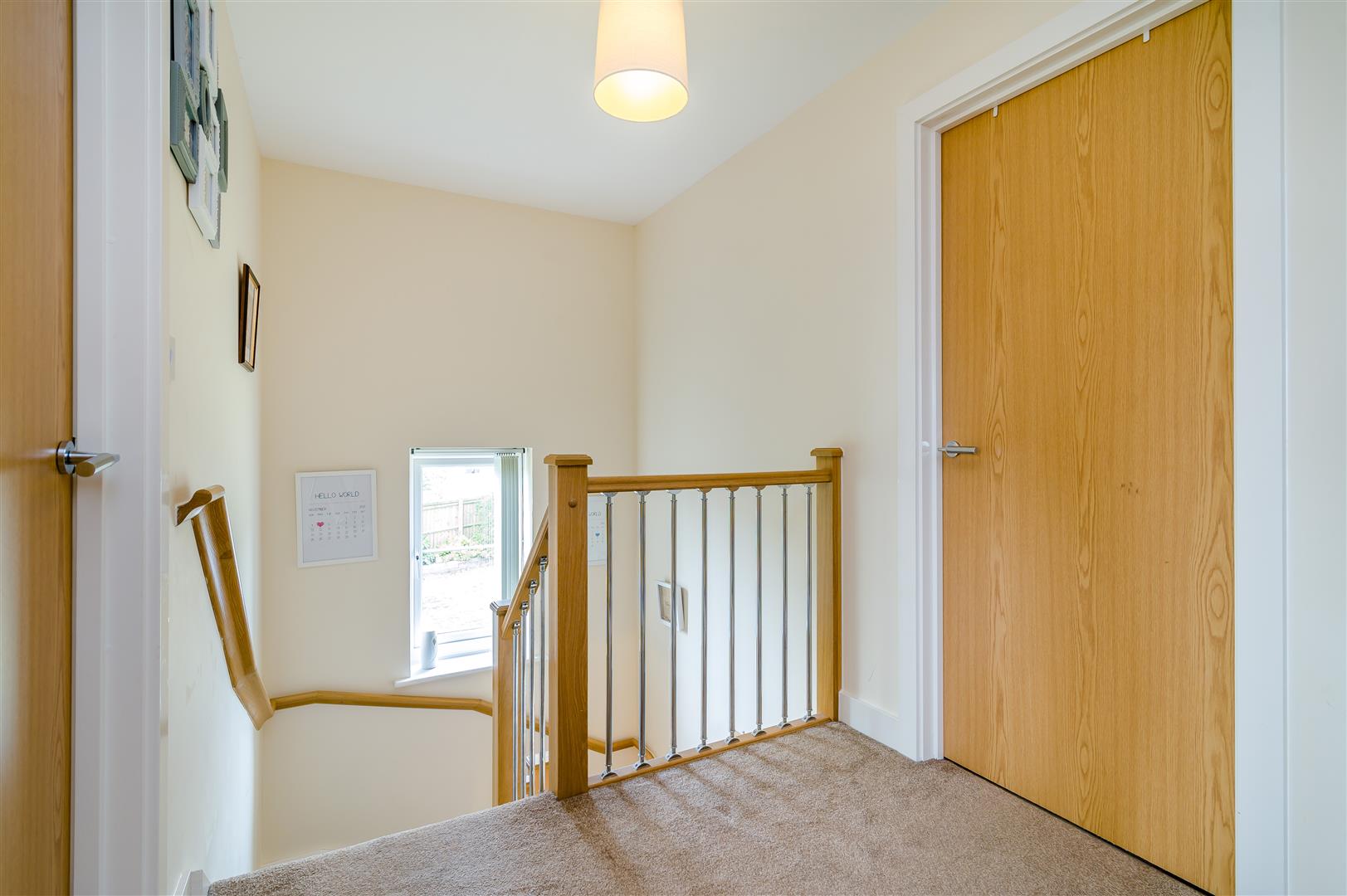 Landing - Access to roof space, door to airing cupboard with hot water tank, slatted shelving and storage space, side aspect window.