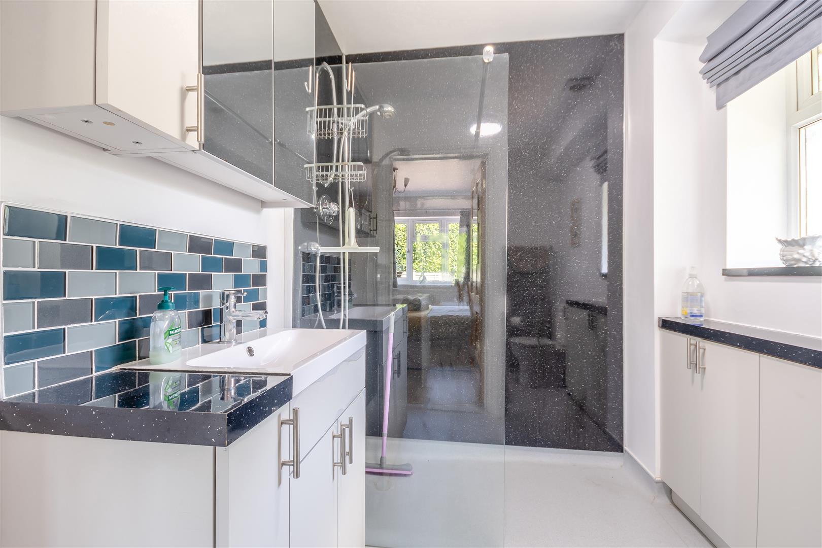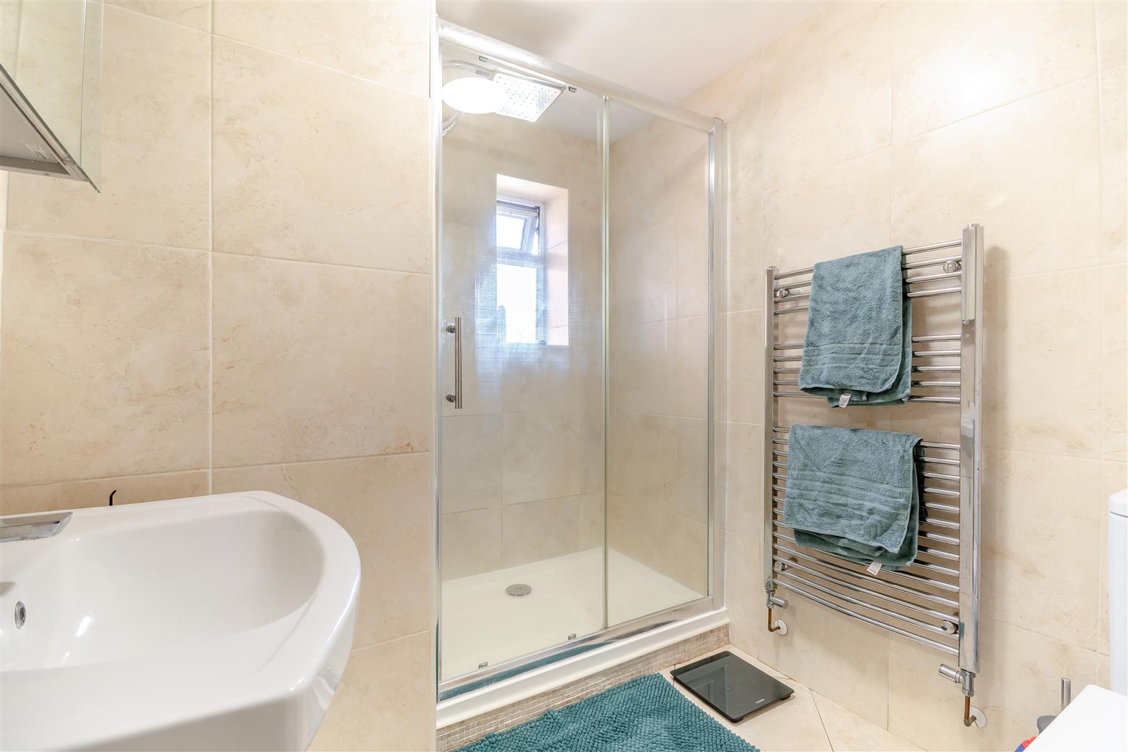 Ground Floor Shower Room - Fitted double shower cubicle and tray, shower, tiled surround, vanity wash hand basin, cupboards below, tiled splashback, close coupled WC, tiled flooring, heated towel rail, side aspect frosted window.