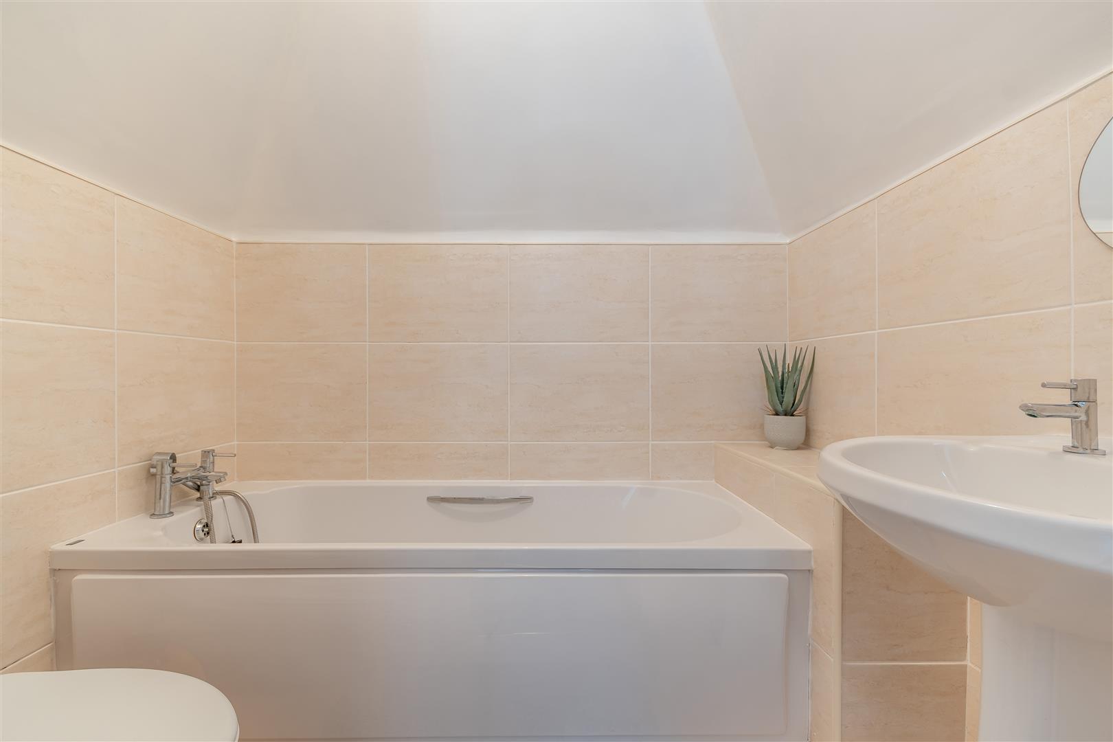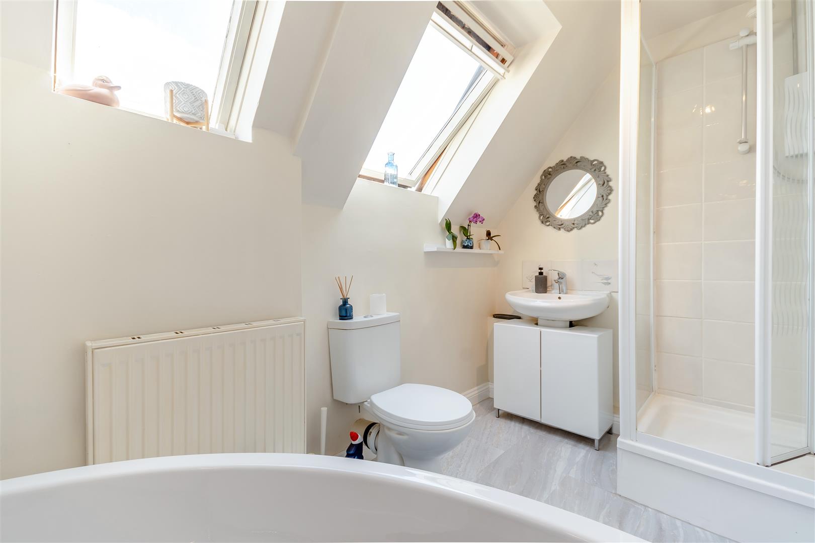 Bathroom - White suite comprising fitted corner bath with shower attachment over, tiled surround, separate shower cubicle and tray, electric shower, tiled surround, vanity wash hand basin with cupboards below, tiled splashback, close coupled WC, radiator, two side aspect Velux roof lights.