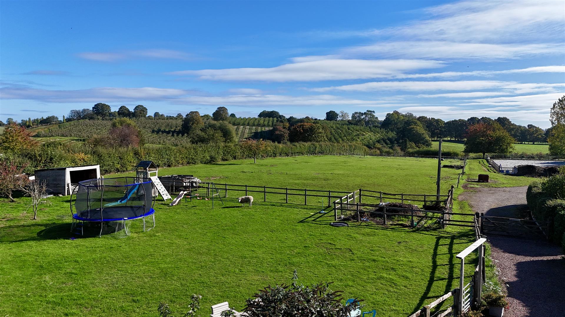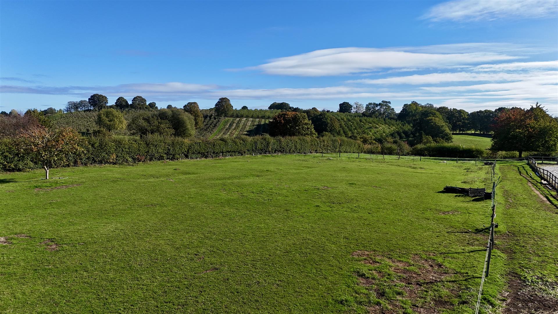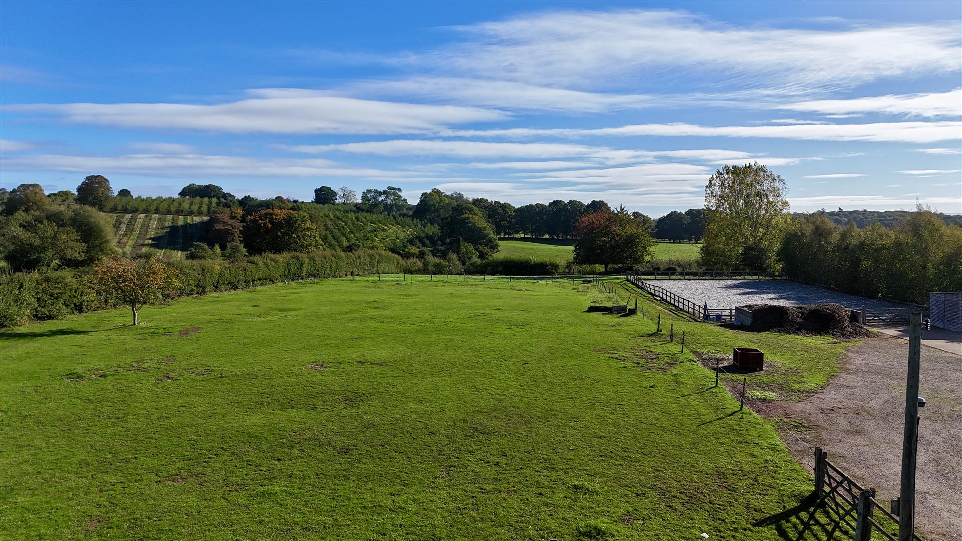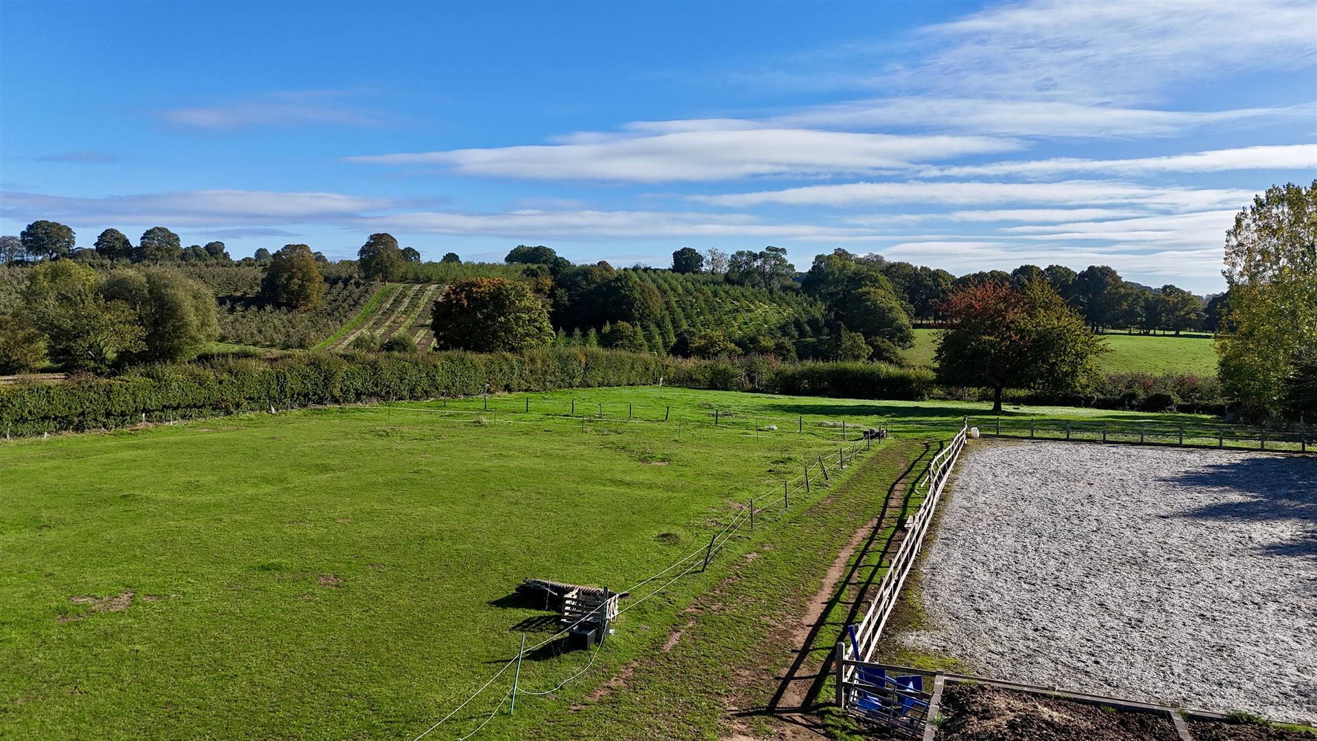 From the main driveway, a further gravelled driveway leads through to the main area of land, separated into three paddocks, all with post and rail fencing, natural hedging boundary, with a large yard, further parking and turning etc. The whole has a superb outlook onto surrounding fields and mature orchards. There is water and power to the stables and a water supply to the land. There is also a field shelter in one of the fields. The whole plot measures approximately 3.1 acres.