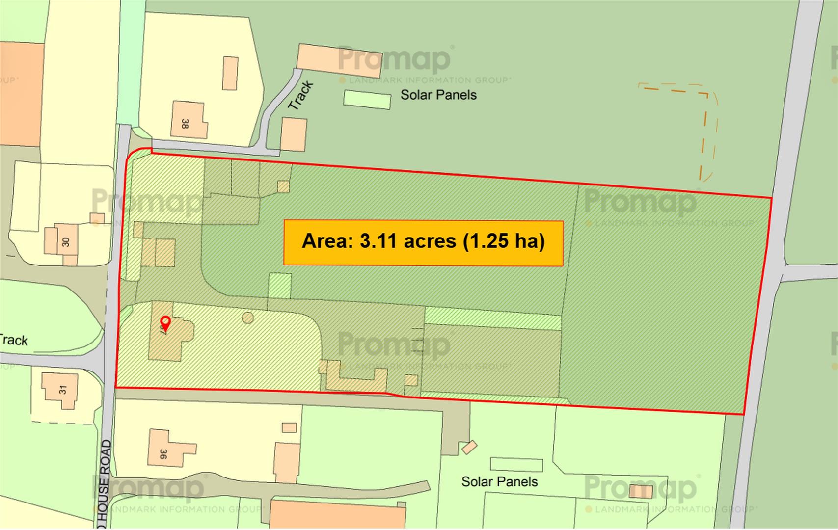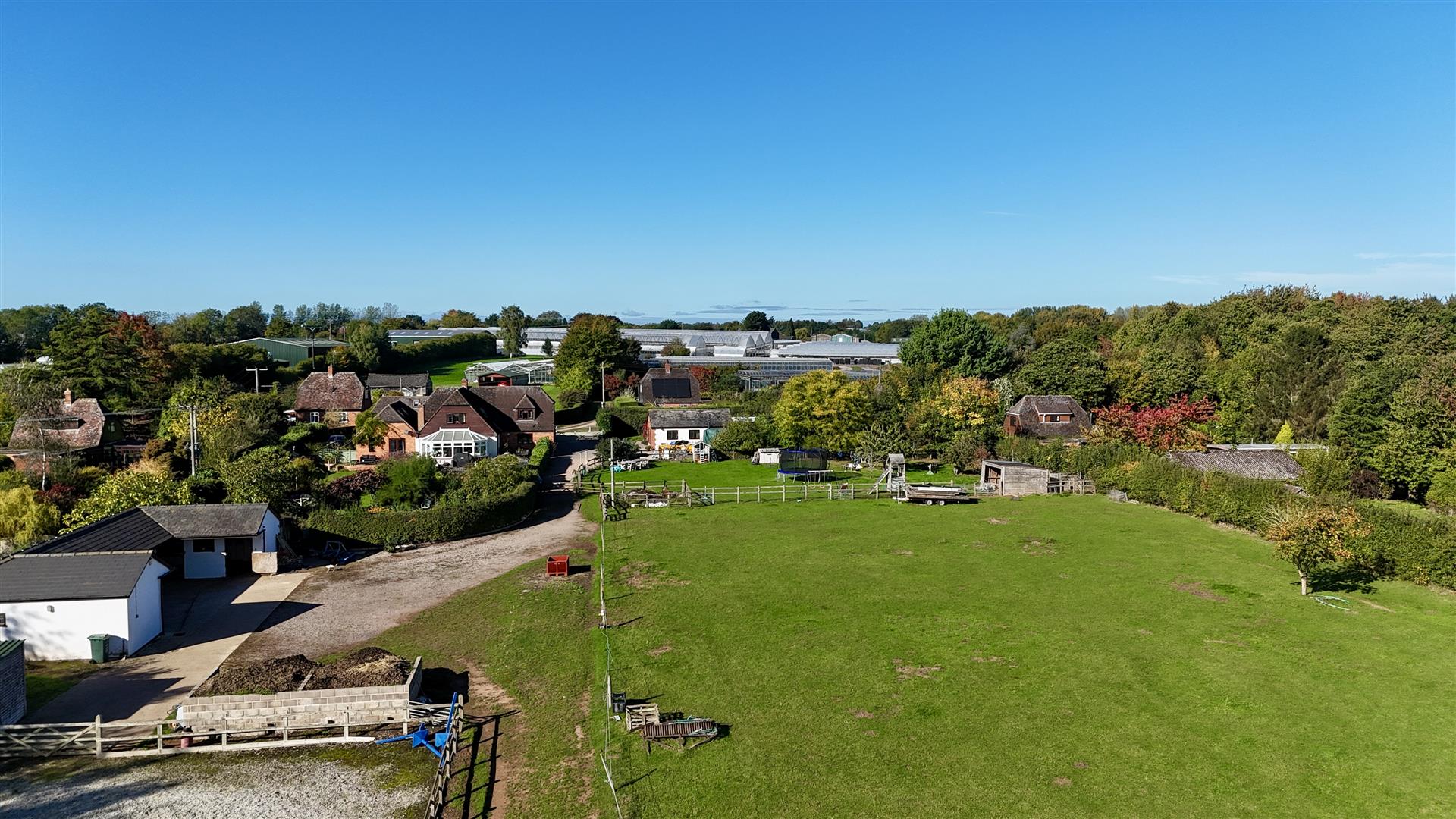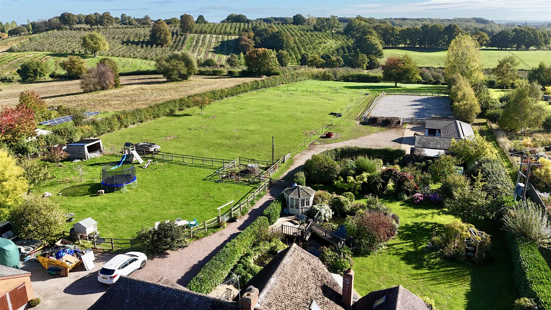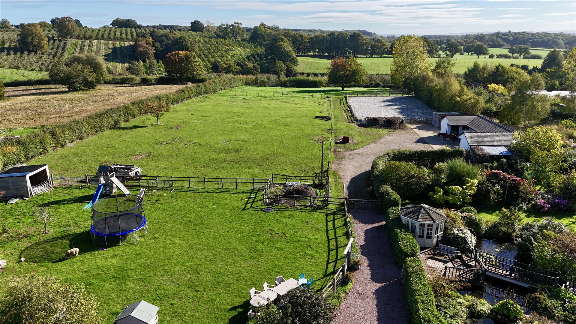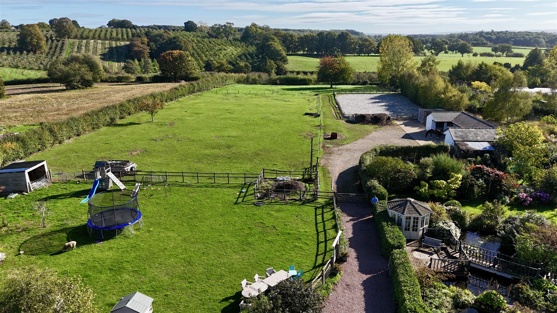From the main driveway, a further gravelled driveway leads through to the main area of land, separated into three paddocks, all with post and rail fencing, natural hedging boundary, with a large yard, further parking and turning etc. The whole has a superb outlook onto surrounding fields and mature orchards. There is water and power to the stables and a water supply to the land. There is also a field shelter in one of the fields. The whole plot measures approximately 3.1 acres.